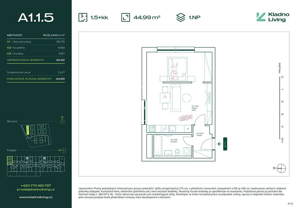 Nabízíme ke koupi moderní byt 1+kk (1,5+kk) o podlahové ploše 45 m² v rezidenčním projektu Kladno Living, který vzniká v jedné z nejatraktivnějších lokalit města Kladno – Kročehlavy. Tento nový developerský projekt představuje jedinečnou příležitost pro ty, kteří hledají nové byty v Kladně nebo investici do nemovitosti s vysokým potenciálem zhodnocení.