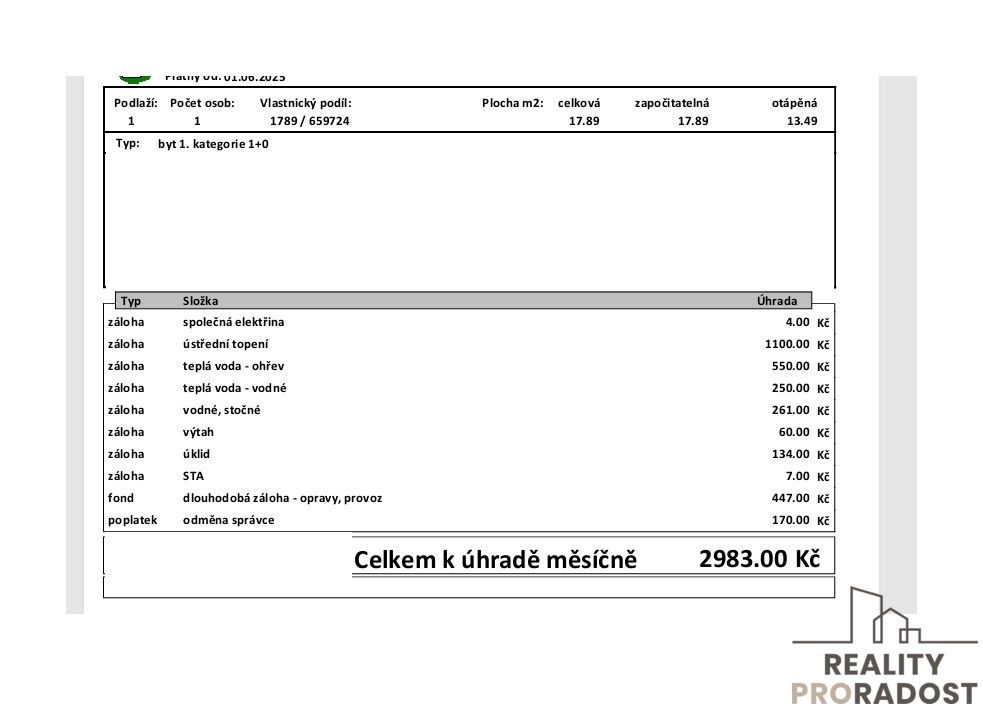 Rozpis záloh je ve fotu. Do fondu se platí 447 Kč, úvěr dům nesplácí.