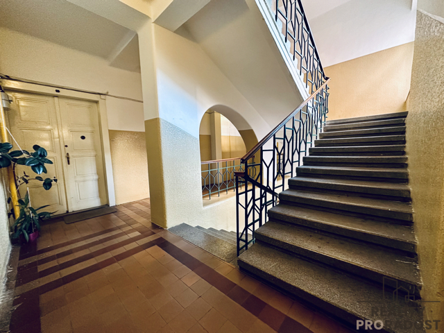 Zděná koupelna je vybavena vanou a umyvadlem, toaleta je samostatná. K dispozici je také praktická komora a balkon přístupný z chodby. K bytu náleží i velký sklep v suterénu domu, ideální pro uskladnění věcí.