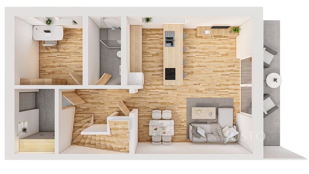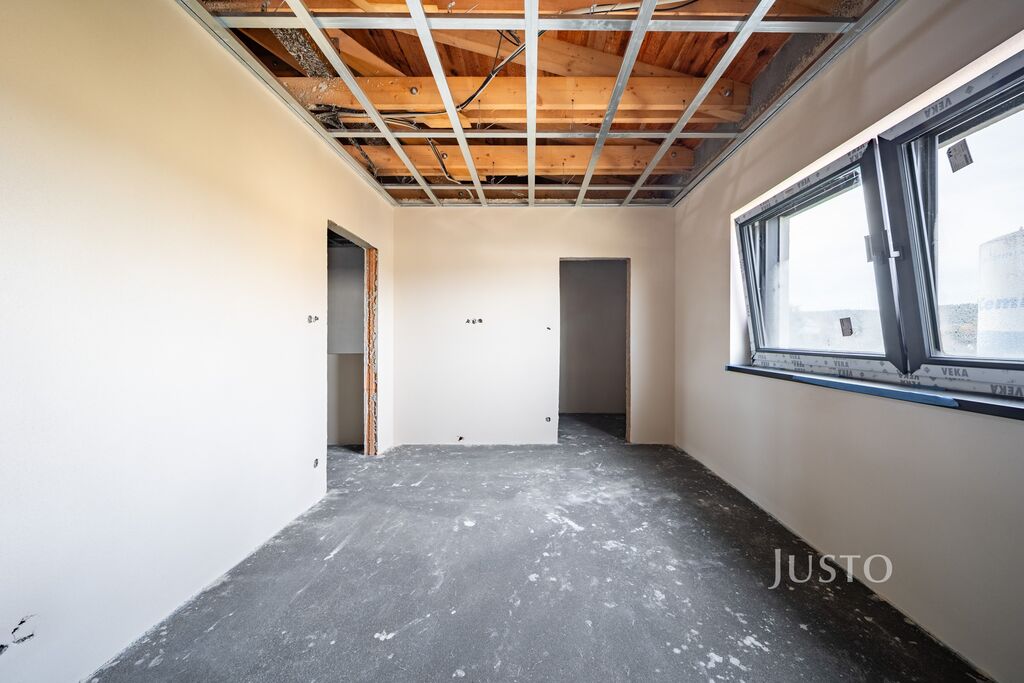 Dispozice domu je promyšlená do posledního detailu. Dominantou přízemí je otevřený obývací prostor s kuchyňským koutem o výměře 34,84 m² – místo, kde se odehrává každodenní rodinný život. Díky přímému vstupu na terasu (13,8 m²) a zahradu se interiér krásně propojuje s venkovním prostorem. Nechybí ani pracovna či pokoj pro hosty (9,69 m²), který se přizpůsobí vašim aktuálním potřebám – ať už jde o práci z domova, nebo ubytování návštěvy. Dále v přízemí najdete zádveří (5,43 m²), chodbu (5,14 m²), technickou místnost (2,10 m²) a koupelnu s walk-in sprchovým koutem a WC (4,69 m²).