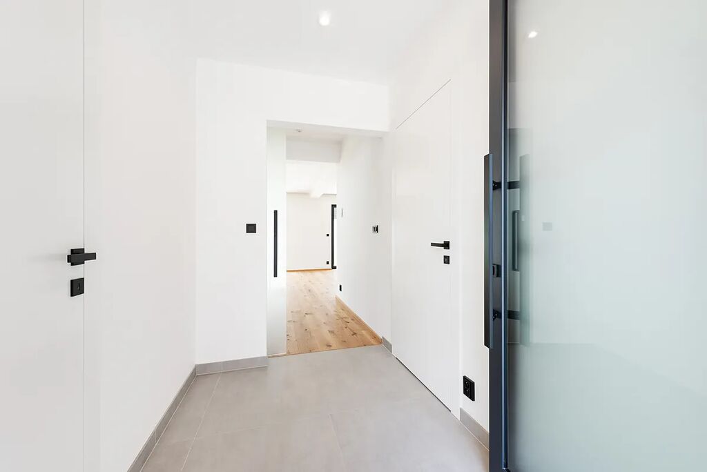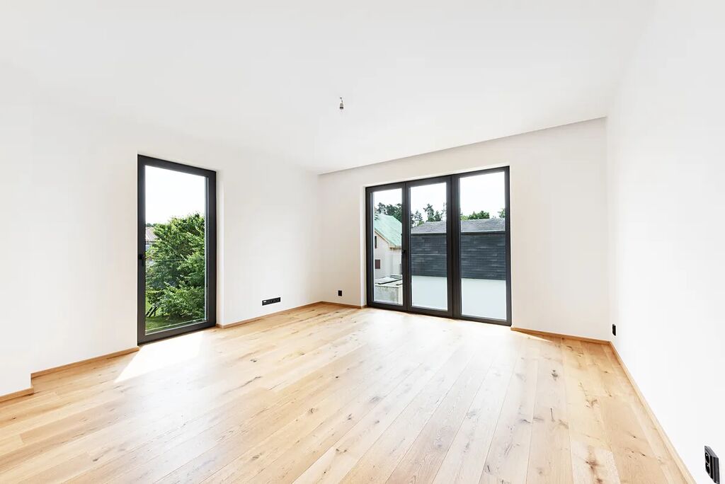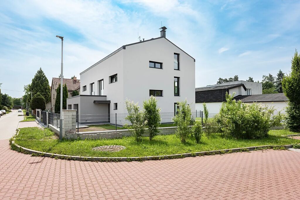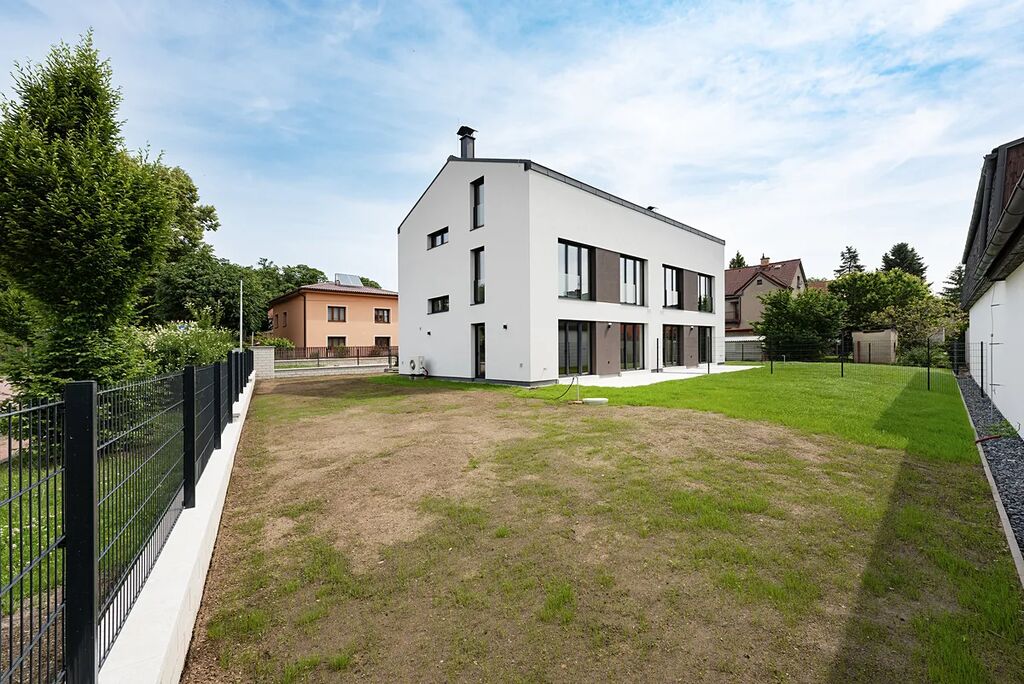 Nabízíme k prodeji nový cihlový RD o dispozici 7+kk s garáží a dalším parkovacím stáním na vlastním pozemku, který se nachází na klidném místě, ve vilkové čtvrti, v ulici Bříšťanská, v Praze Horních Počernicích. Pravá část dvojdomu leží na pozemku o celkové výměře 455m2, zastavěná plocha domu je 99,5m2 a plocha užitná 218m2 vč. garáže. Dům má tři nadzemní podlaží. Dispozice domu - v přízemí domu se nachází zádveří (4m2), hala (5m2), obývací pokoj s kuchyňským koutem (40m2) se vstupem na terasu a zahradu domu, šatna (4m2), samostatné WC s umyvadlem (1,5m2), schodiště s podestou (10m2) a garáž (21m2). V 2. nadzemním podlaží je situována ložnice (20m2), šatna (12m2), dětský pokoj (19m2), koupelna s vanou, sprchovým koutem, umyvadlem a toaletou (10m2), hala se schodištěm (10m2). Ve 3. nadzemním podlaží je situována hala, pracovna (20m2), dva dětské pokoje (20m2 a 12m2), koupelna se sprchovým koutem, umyvadlem a toaletou (10m2). Velká pozornost byla věnována výběru zařizovacích předmětů a vysokému standardu domu. Na podlahách domu je v obytných místnostech použita kvalitní dubová dřevěná podlaha, interiérové dveře jsou bezfalcové, reverzní, v bílém matném laku, v koupelnách je použita italská velkoformátová dlažba, podomítkové baterie, bidetové sprchy u toalet, atd. Vytápění domu je řešeno pomocí podlahového vytápění. Zdrojem tepla je tepelné čerpadlo De Dietrich a krbová kamna s výkonem max. 9KW umístěná v obývacím pokoji. Vlastním zdrojem energie je 5 kusů fotovoltaických panelů od výrobce Meyer Burger o celkovém výkonu 1950 Wp/ks (výroba Švýcarsko/Německo). Vyrobená energie bude prioritně spotřebována v objektu, nevyužité přebytky budou dodány do distribuční sítě. Je počítáno s případným rozšířením panelů na střeše a předělání systému na bateriový. Dům nabízí možnost propojení bydlení a podnikání, případně lze v horním patře vytvořit lehkou úpravou samostatnou bytovou jednotku pro vícegenerační bydlení. Na schodech bude usazeno zábradlí z bezpečnostního skla, které je nyní ještě ve výrobě. Dům je možno financovat hypotékou! K prodeji je i levá část dvojdomu s pozemkem o výměře 376m2.