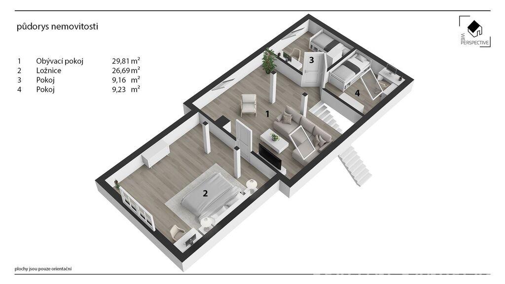 Přízemí je dělené na zádveří a předsíň, obývací pokoj s krbovou vložkou, vybavený kuchyňský kout s lux. vestavěnými spotřebiči, koupelnu se sprchovým koutem a prádelnou s toaletou a tech. místnost se šatnou. Původní garáž je využívaná jako klidová zóna ve které se nachází infrasauna a mini fitness, vstup ze zahrady. Na zahradě krásná krytá pergola, zahradní domek ........