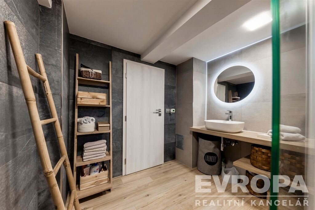 Interiér je dokonalým propojením dřeva, doplněné o designovou dlažbu, luxusní spotřebiče a hlavně je zde na každém kroku cítit otisk vkusného a praktického využití každého koutu.