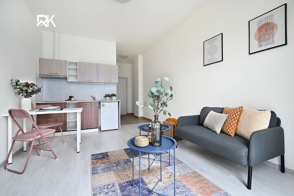 Dispozici bytu tvoří světlý obývací pokoj s kuchyňským koutem a koupelna s toaletou. K jednotce náleží také praktická sklepní kóje o velikosti 2 m², umístěná na stejném patře – což je velkou výhodou pro snadný přístup a uskladnění věcí.