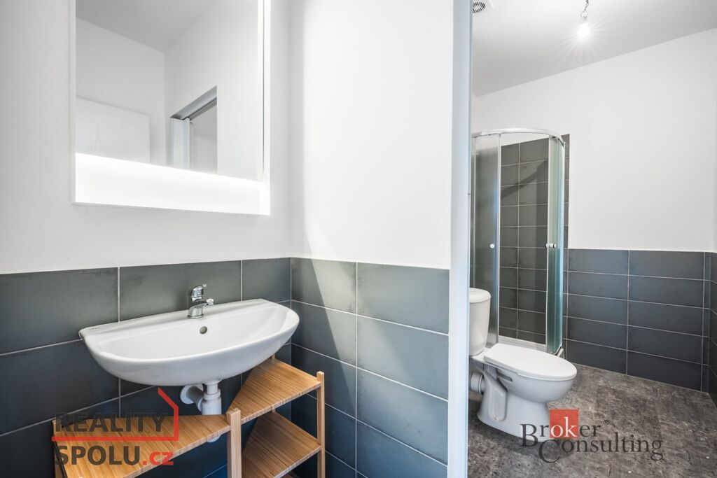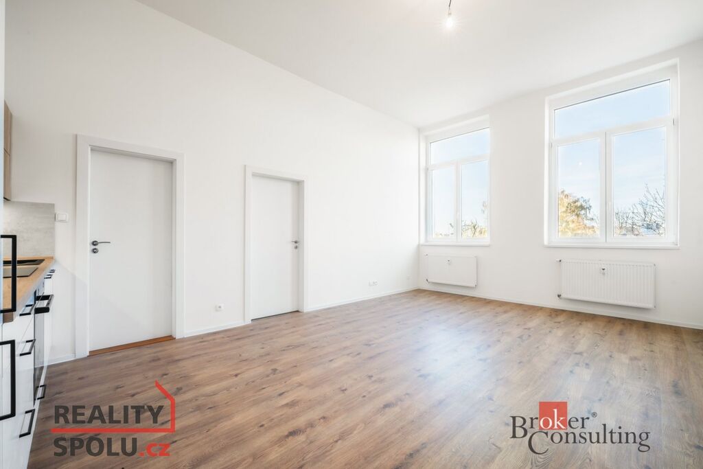 Součástí je plně vybavená kuchyňská linka se spotřebiči – elektrická trouba, indukční varná deska a lednice s mrazákem. Praktická dispozice bytu nabízí dostatek prostoru pro pohodlné bydlení.