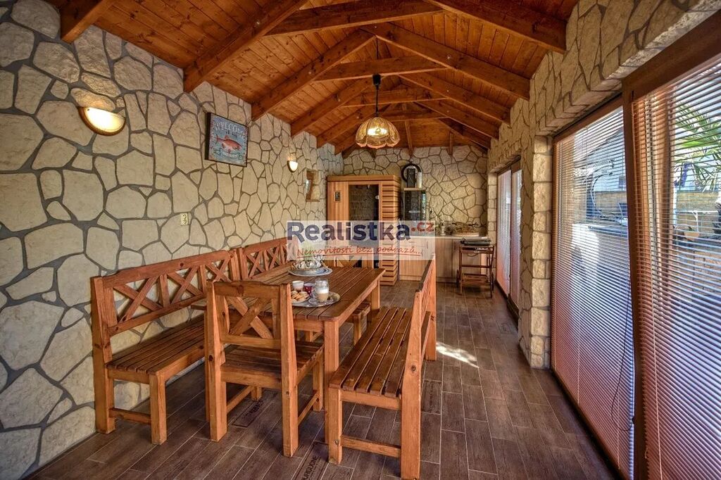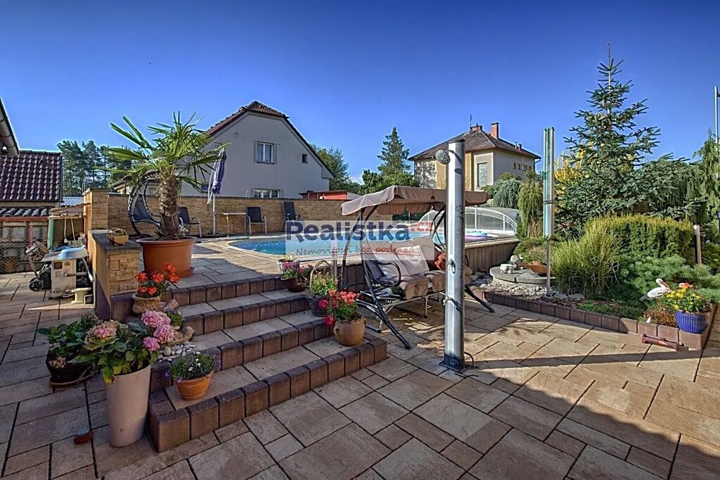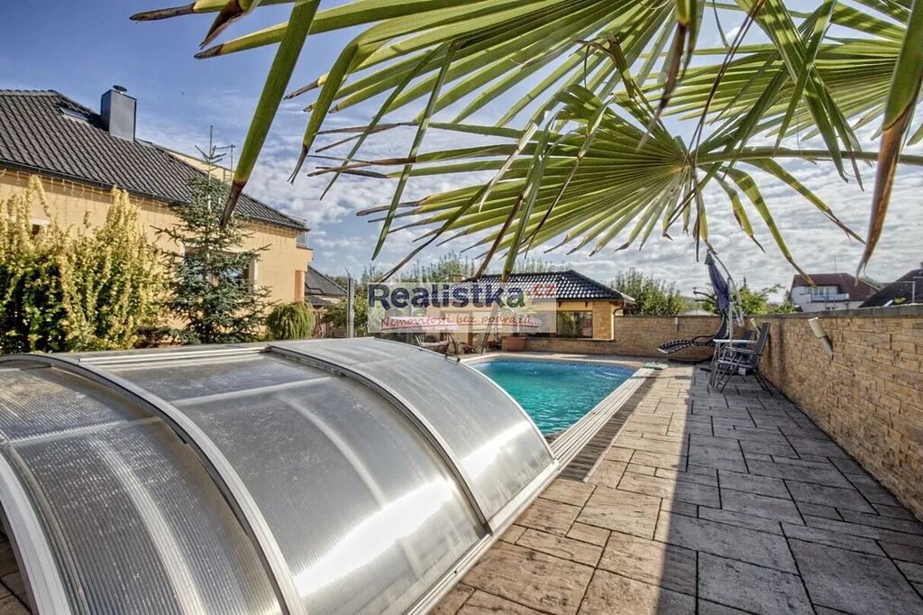 Na pozemku se nachází také zastřešený vyhřívaný bazén 8 × 4 m, prostorná garáž s posilovnou a krytým stáním pro další vůz a unikátní prosklený pavilon s posuvnými francouzskými okny, vybaveným interiérem, saunou a krbovými kamny – místo, které v každém ročním období zve k odpočinku.