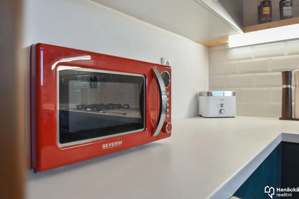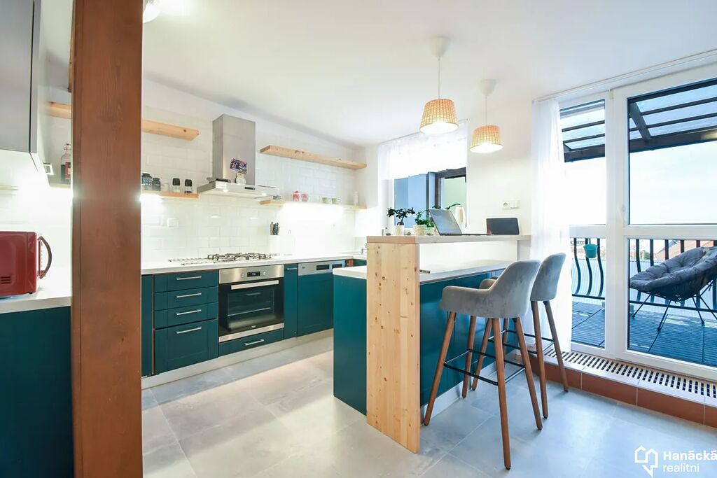 Byt působí velmi vzdušně a světlé prostory mu dodávají příjemnou atmosféru. Centrální část tvoří prostorný obývací pokoj s krbem, jídelní zónou a kuchyní na vyvýšeném pódiu, doplněnou o barový pult a samostatnou spižírnu. Kuchyně je plně vybavena spotřebiči (elektrická trouba, plynový sporák, lednice, myčka). Z kuchyně je vstup na balkon orientovaný do klidného vnitrobloku s posezením.