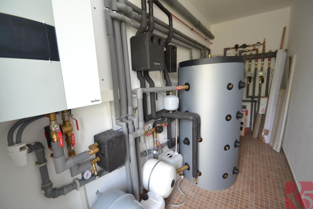 Vytápění domu vlastním plynovým kotlem, umístěným v technické místnosti nacházející se v přízemí domu. Plynový centrální kotel slouží pro ohřev teplovodního podlahového topení. Teplá voda bude ohřívána solárními panely ve velkém zásobníku na TUV s plynovým dohřevem.
