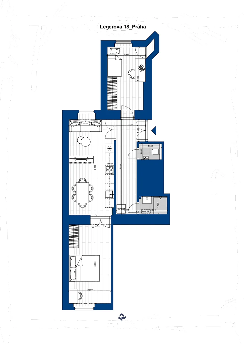 Nabízíme nový byt 3+kk po kompletní rekonstrukci v ulici Legerova, Nové Město, Praha 2. Byt je čerstvě po rekonstrukci (dokončeno 10/2025), nový, neobydlený, příprava na kuchyňskou linku. Byt o celkové ploše 62 m², k tomu zděný sklep o velikosti 10 m² v suterénu, který je možný obývat (pynové vafky, el., umyvadlo, dřevěná zavěšená dvoupostel).