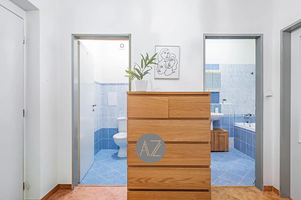 Z pravé části chodby je vstup do šatny, ve které jsou zakázkové vestavěné skříně. Na protilehlé části chodby se nachází samostatné WC a koupelna s vanou. Součástí hlavní obytné místnosti je kuchyňská linka.
