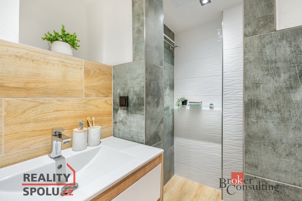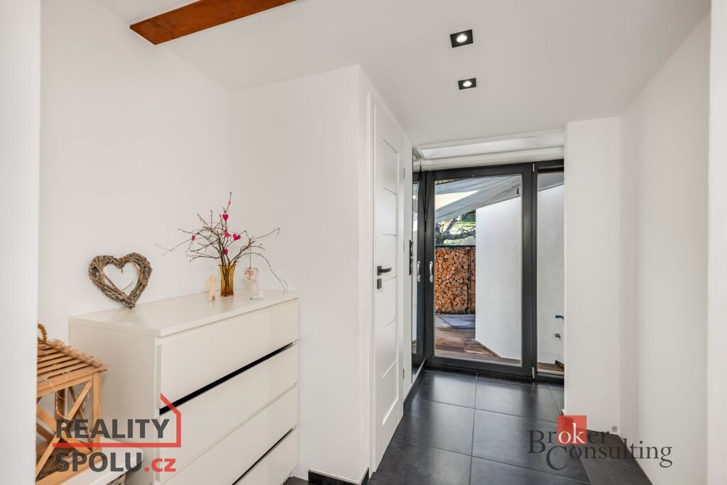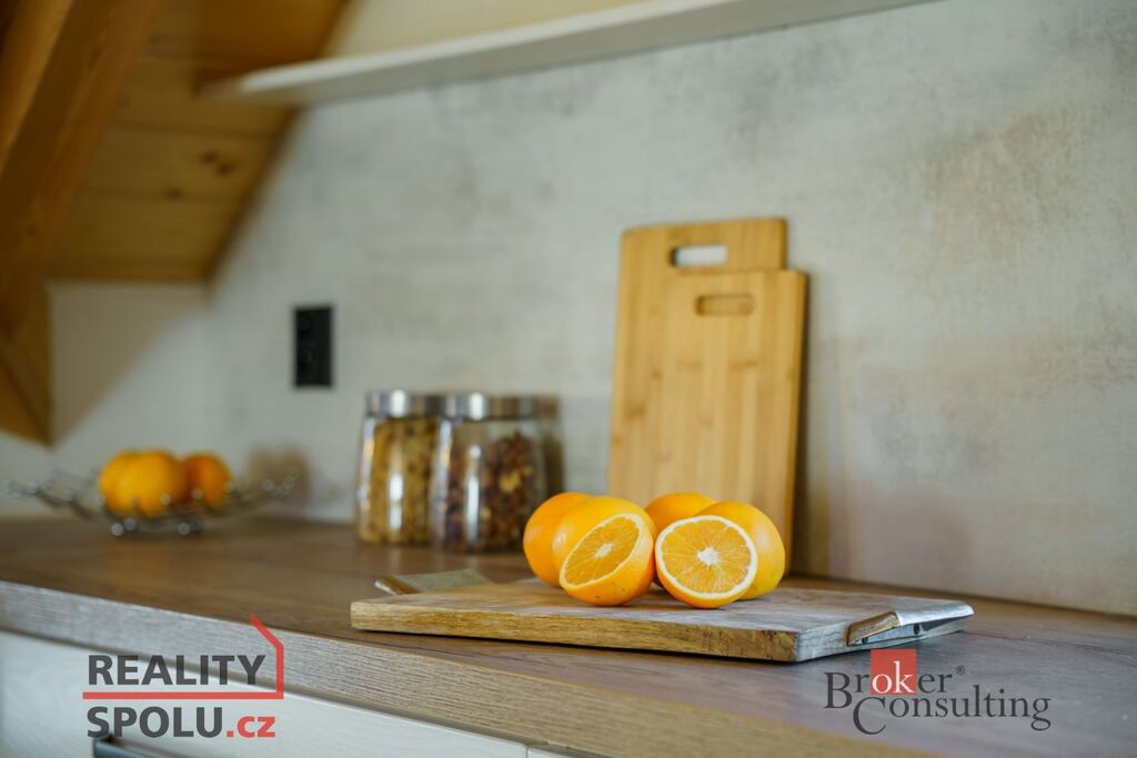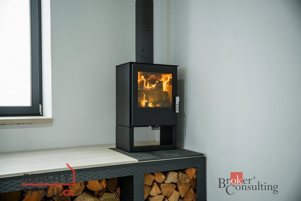Přímý vjezd, dálkově ovládaná brána, připojení na kanalizaci, obecní i vlastní zdroj vody, internet. Na každém podlaží ovládání topení zvlášť, v koupelně topný žebřík. Fasáda modřín, podlahy vinyl, střešní okna Velux.
