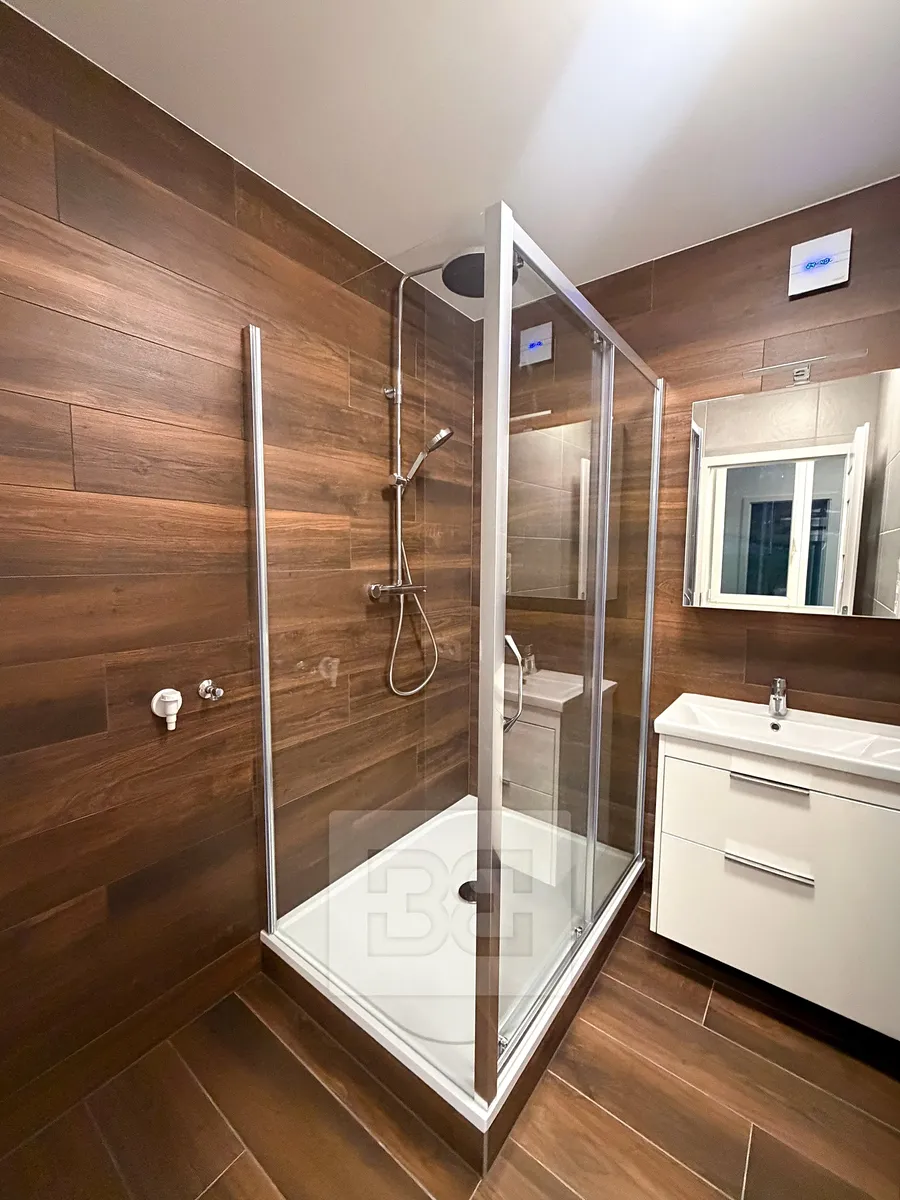 V moderně zařízené koupelně se nachází nový sprchový kout, umývadlo se spodní a horní skříňkou a dostatkem místa pro další úložný prostor. Samozřejmostí je přípojka na pračku vedle sprchového koutu. Toaleta je oddělená samostatně.