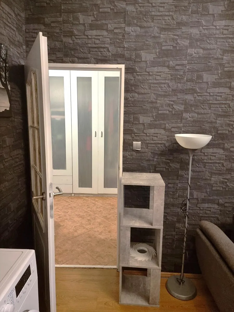 Je zde menší kuchyňská linka s elektrickým sporákem.. V koupelně je vana obložená moderními dlaždicemi a oddělena příčkou od toalety.