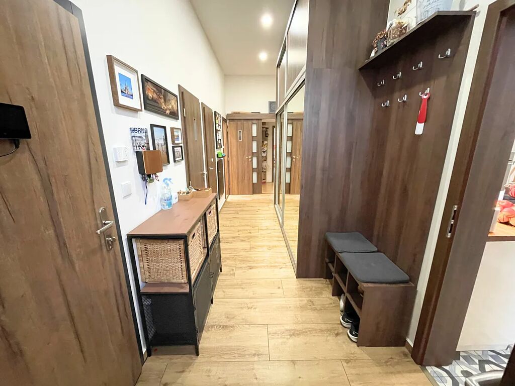 Při vstupu do bytu vás přivítá prostorná předsíň s velkou vestavěnou skříní, ze které je přístup do obývacího pokoje s kuchyní, na toaletu, do spíže a do obou koupelen.