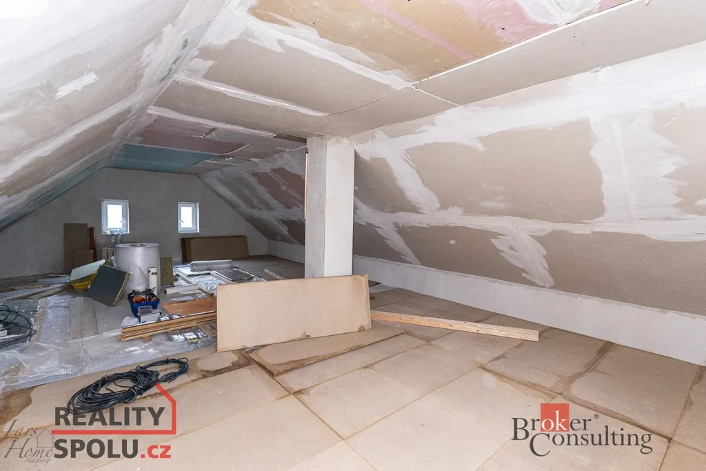 Rodinný dům se skládá ze dvou podlaží. Přízemí je již dokončené, najdete zde prostorný obývací pokoj s přípravou na kuchyni, dále přímý vstup na zahradu, dvě ložnice, koupelnu a toaletu. Díky dřevěným stropním trámům působí interiér velmi příjemně. V patře je připraven rozsáhlý podkrovní prostor, kde máte jedinečnou příležitost si dokončit dům dle svého uvážení.