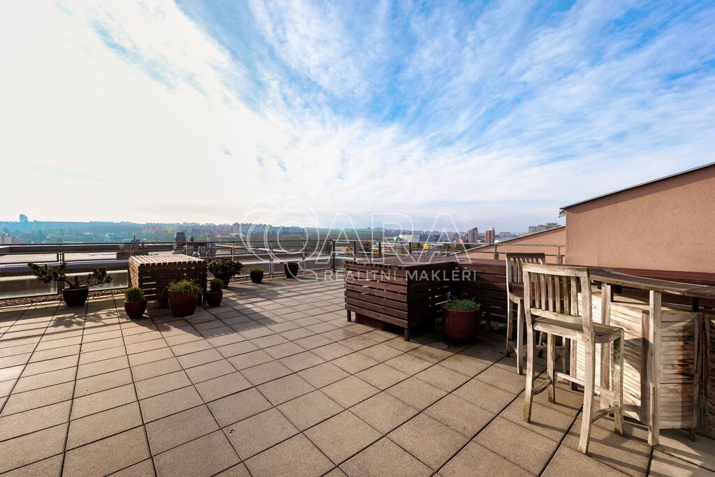 Nadstandardní byt disponuje podlahovou plochou 91 m² + terasou o rozloze 100 m², sklepem a dvěma garážovými stáními.