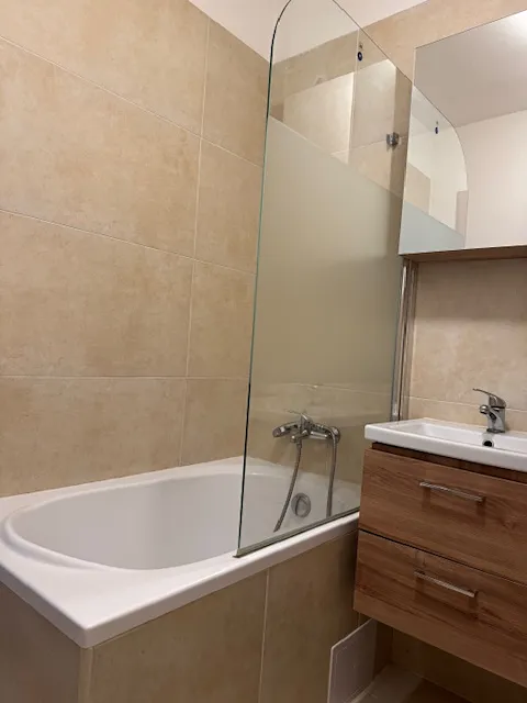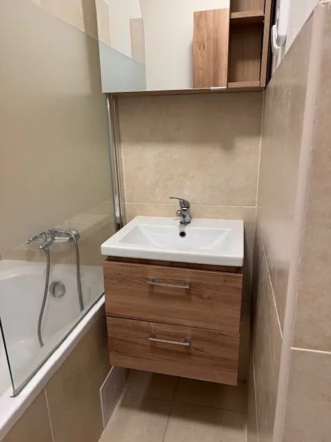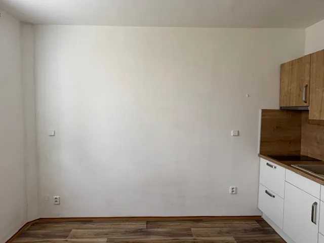Byt se nachází ve 3.NP. panelového domu a je orientován na jihozápad. Byt je velmi pěkný, slunný a klidný. Součástí pronájmu je jeden pokoj s kuchyňskou linkou. Kuchyň je vybavena digestoří, vestavnou sklokeramickou deskou, která má dvě plotýnky, lednici s mrazákem a mikrovlnou troubou. V předsíni je umístěna šatní skříň, koupelna je s malou vanou, umyvadlem se skříňkou a WC. Podlaha v pokoji je lino, u vchodu do bytu také lino, v okně jsou bílé žaluzie. Byt je určen k dlouhodobému pronájmu.