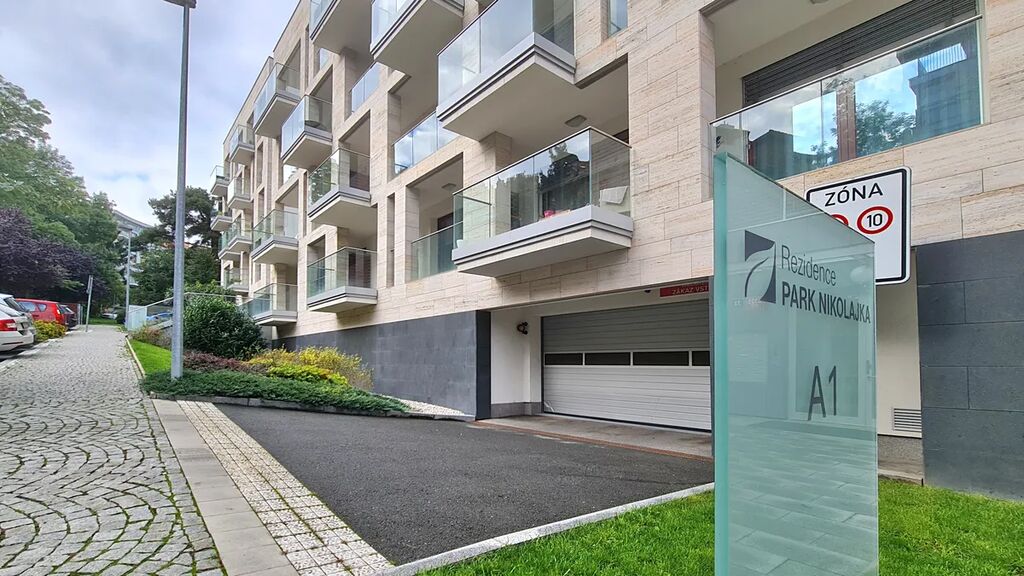 K bytu patří také sklep, jedno parkovací místo a uzavřená garáž v suterénu budovy.