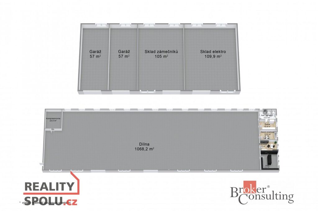 Areál tvoří rozsáhlá průmyslová hala (užitná plocha 1227 m2) s navazujícími pozemky (9000 m2), vhodná pro výrobu, skladování či další průmyslové využití.