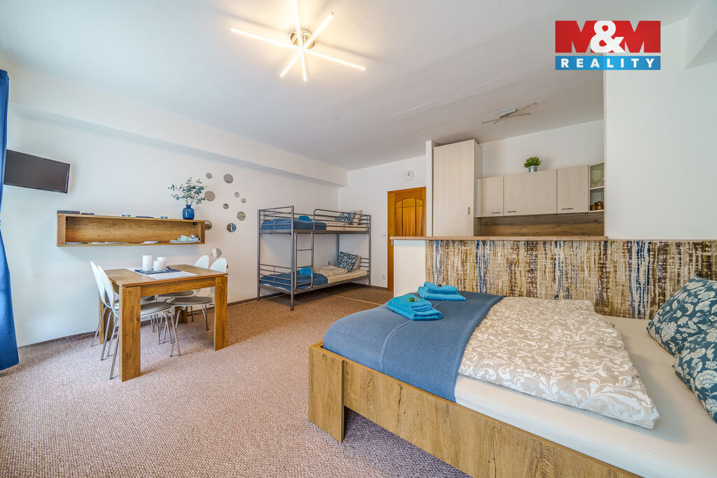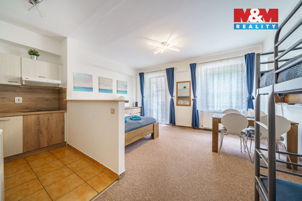 Právě Vám nabízíme hezký a útulný byt o dispozici 1+kk s balkonem v osobním vlastnictví v Jáchymově v ul. K Lanovce. Byt se nachází v 1.NP v cihlovém domě s výtahem, o celkové výměře 36 m2 vč. balkonu a sklepa, prošel rekonstrukcí a prodává se včetně vybavení. K dispozici je vyhrazené parkovací místo před domem za roční pronájem. K bytu náleží sklepní kóje a společná lyžárna v domě. V současné době je byt pronajímán přes Booking s možností přenechání zavedené klientely. Výborná poloha v blízkosti přírody, lázní a lyžařských areálů Boží Dar, Klínovec a Plešivec. Více info v RK.
