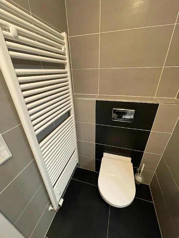 Koupelna disponuje sprchovým koutem, umyvadlem, nástěnnou skříňkou s osvětlením, závěsným WC, topným žebříkem, prostorem a připojením pro pračku. Pračka je ve vlastnictví současného nájemce.