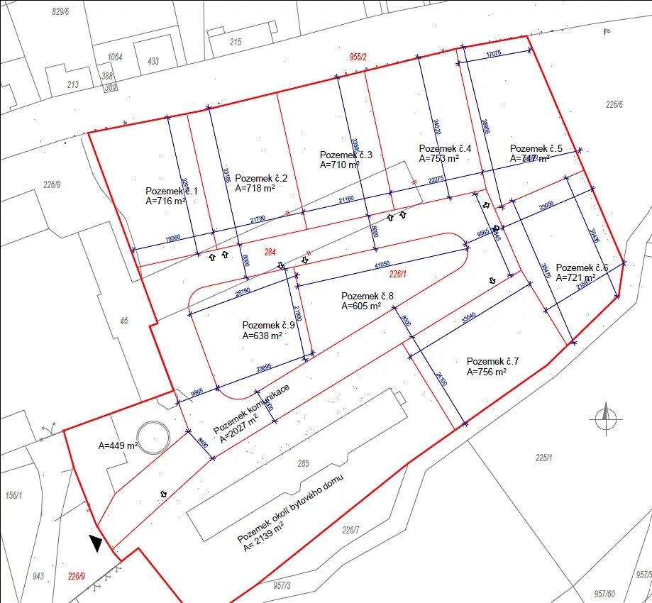 Pozemek bude rozdělen na 9 parcel, které jsou určené ke stavbě rodinných domů. V rámci budoucí výstavby lze uvažovat o rodinných domech s jednou či dvěma bytovými jednotkami. Samotný projekt bude v režii nového majitelem, přičemž lze spolupracovat s projekční kanceláři, která zajišťuje první stupeň povolovacího procesu.