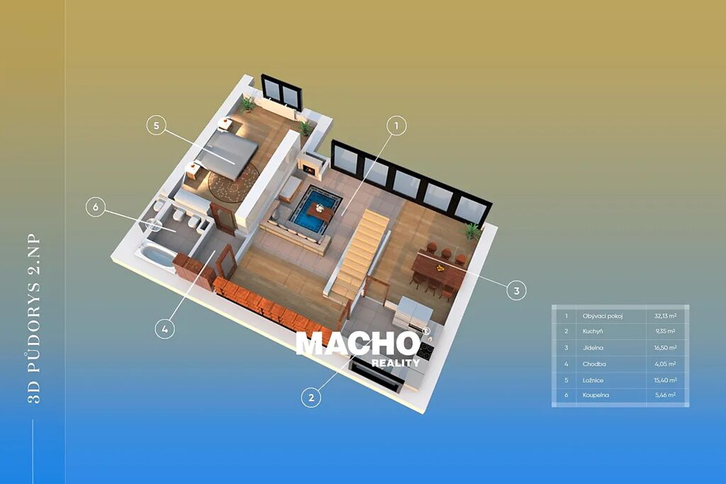 Ve 2. nadzemním podlaží nalezneme prostorný obývací pokoj, kterému dominuje stylový krb. Vedle něj se nachází vstup na útulnou terasu, jako stvořenou pro posezení s rodinou nebo přáteli. Patro dále nabízí kuchyň, vybavenou kuchyňskou linkou s vestavěnými spotřebiči, jídelnu, ložnici, koupelnu s vanou, toaletou a bidetem.