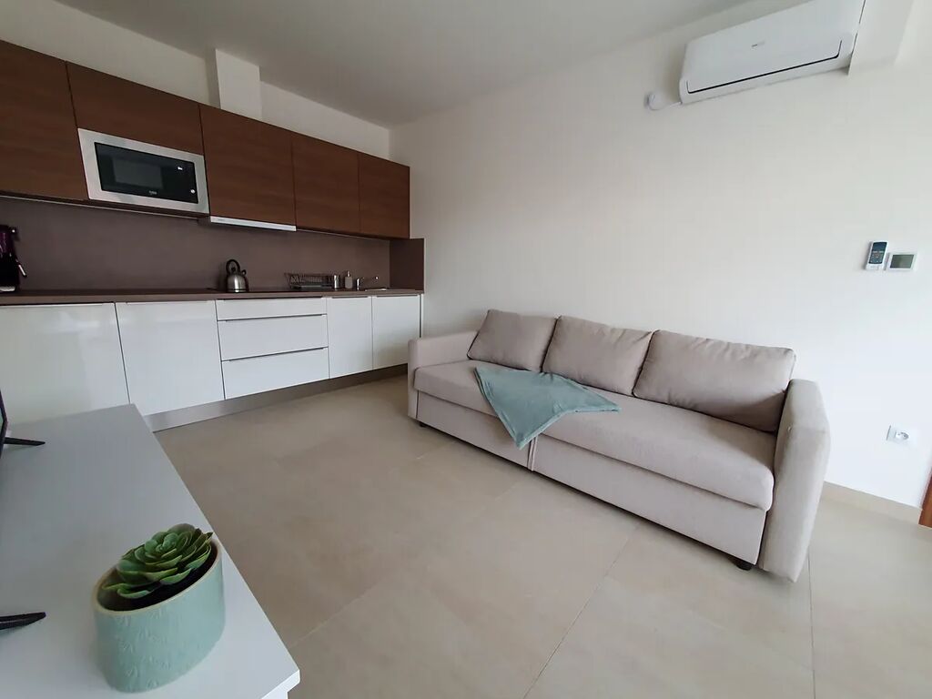 Interiéru dominuje velká kuchyňská linka s ostrůvkem a kvalitní kožená rozkládací sedací souprava. V obývacím pokoji jsou čtyři lůžka a další TV. V koupelně je pračka a samostatná sušička. Tento byt je navíc vybaven venkovními elektricky ovládanými žaluziemi a výsuvnou elektrickou markýzou. Terasa je dále vybavena kvalitním zahradním nábytkem a solární sprchou. Prostor zahrady je lemován ovocnými stromy a levandulemi.