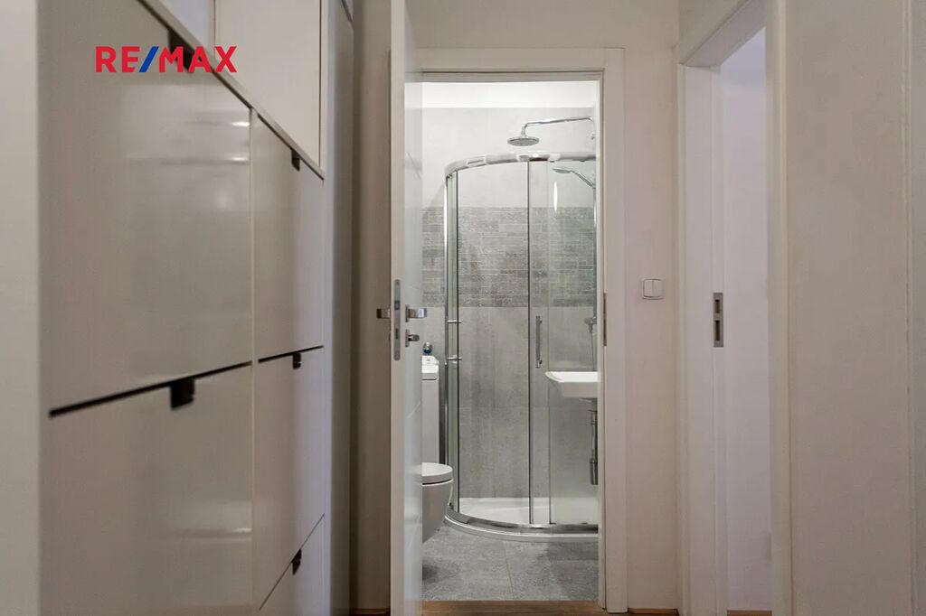 Kuchyně s moderní kuchyňskou linkou, lednicí a barovým sezením. Obývací část a ložnice s okny do klidného vnitrobloku. Koupelna se sprchovým koutem a toaletou, prostorná předsíň. Dřevěné parkety, dlažba. Sklep.