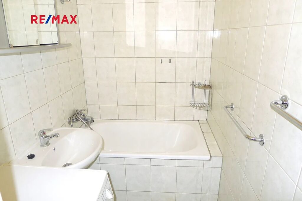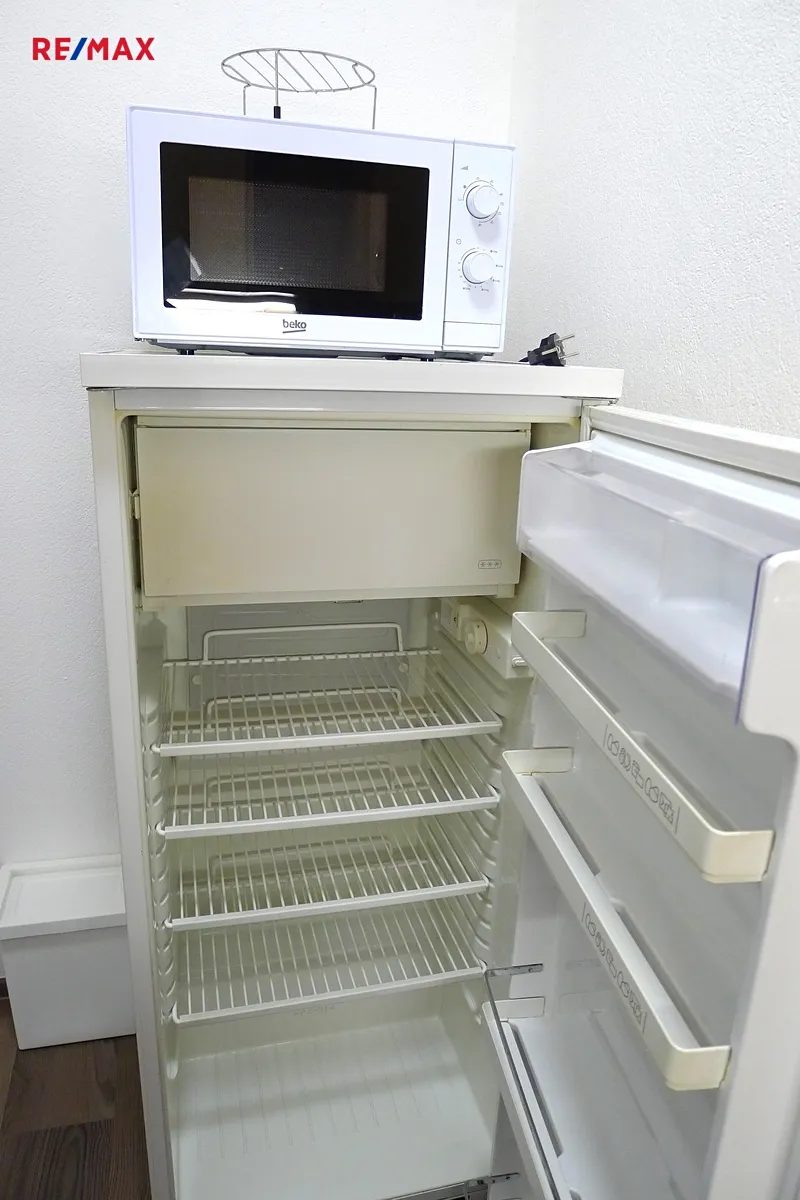 Kuchyňský kout je vybaven elektrickým dvouplotýnkovým vařičem, lednicí s mrazákem a mikrovlnnou troubou. V koupelně je vana, umyvadlo se skříňkou a pračka. Byt není dále vybaven. Na oknech jsou žaluzie. Ohřev vody a topení dálkově.