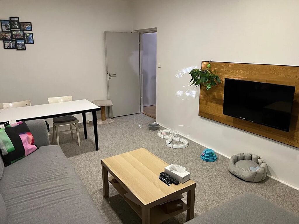 Částečně zařízený byt: kuchyň, pračka, vestavěná skříň v předsíni.