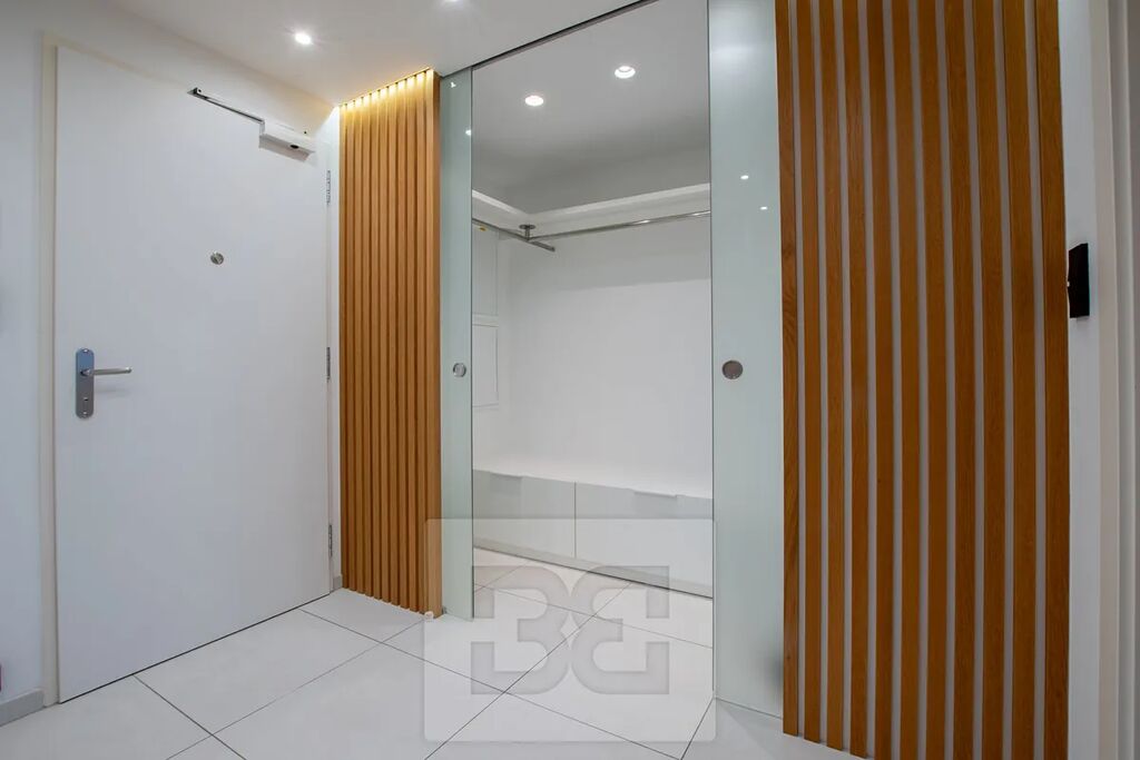 Po celé délce propojovací chodby se nacházejí vestavěné skříně, které poskytují dostatek úložného prostoru. V bytě je také samostatná šatna umístěná u vstupních dveří.