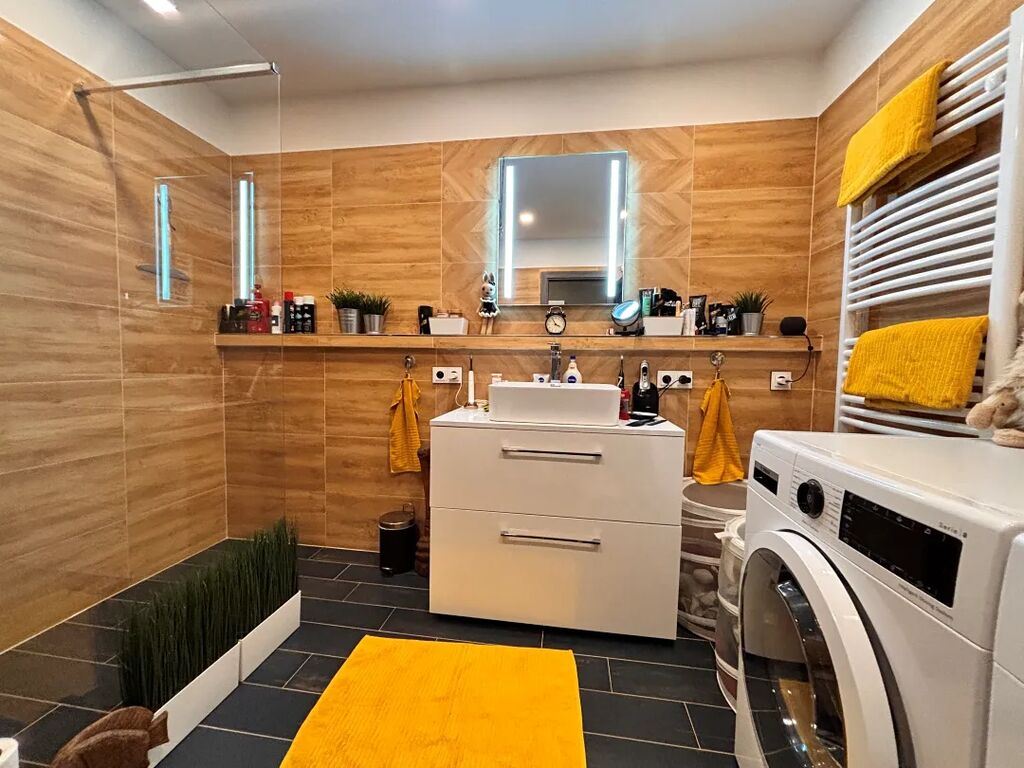 • Podlahová plocha bytu je zateplena od sklepa • Byt je osazen zárubněmi a dveřmi SAPELI, v jednom dekoru • Zapuštěné posuvné dveře SAPELI do koupelny • Kuchyňská linka na míru s vestavěnými spotřebiči. Indukční deska, mikrovlnná trouba, myčka (60cm), horkovzdušná trouba s grilem. (značky BOSH) • Vestavěna lednice s mrazákem (LG) • Zděné jádro Ytong • Koupelna se sprchovým koutem Walk-in • Déšť plus sprchová hlavice • Podomítková baterie Ravak • Toaleta s bidetem Geberit aquaclean Tuma comfort • Zásobník teplé vody Ariston (80l) • Vyhřívané zrcadlo • Žebříkový radiátor napojen na elektrokotel, lze používat i mimo topnou sezónu ( topná tyč ) • Elektrokotel BOSH (6kW) zajišťuje vlastní vytápění, rozvod do radiátorů veden v mědi. Vytápění řízeno dálkovým termostatem Honeywell • Nová elektroinstalace vedená stropem, zasekána v mědi, nová rozvodná skříň, nadstandardně řešené zásuvky • Snížené stropy s LED osvětlením, dvojí provedení, závěsné světlo v kuchyni Philips s wifi ovládáním. • Rozvod internetu (skříňka pro rozvod internetu Extenderlan) ložnice a obyvák internet veden kabelem (zbytek bytu wifi připojení) zesilovač Unifi • Na chodbě vestavěná skříň na míru