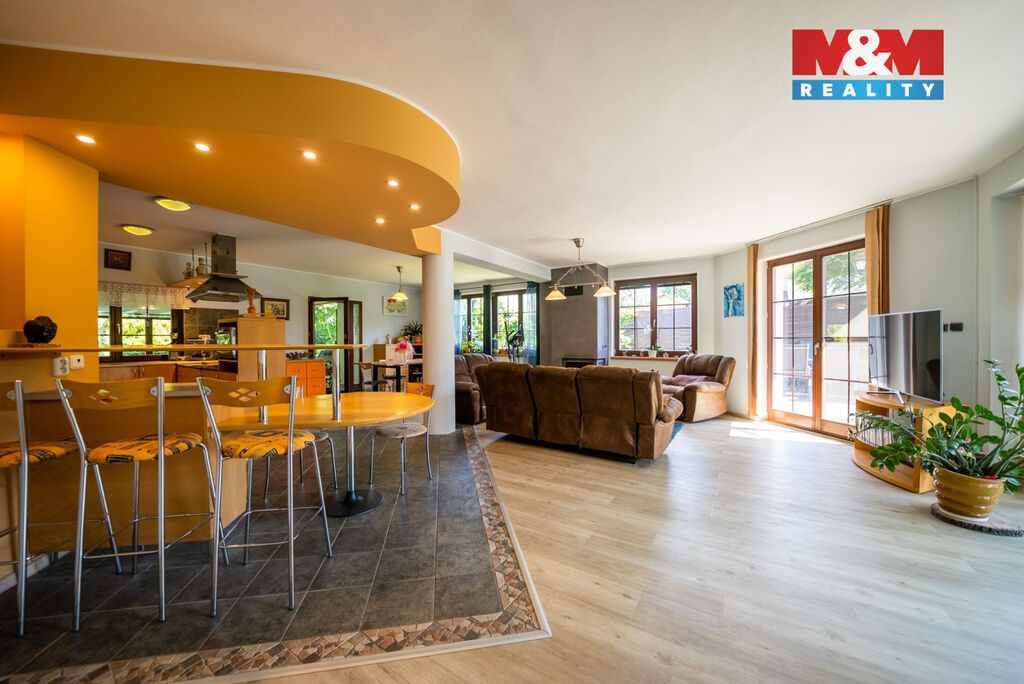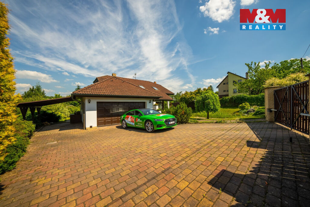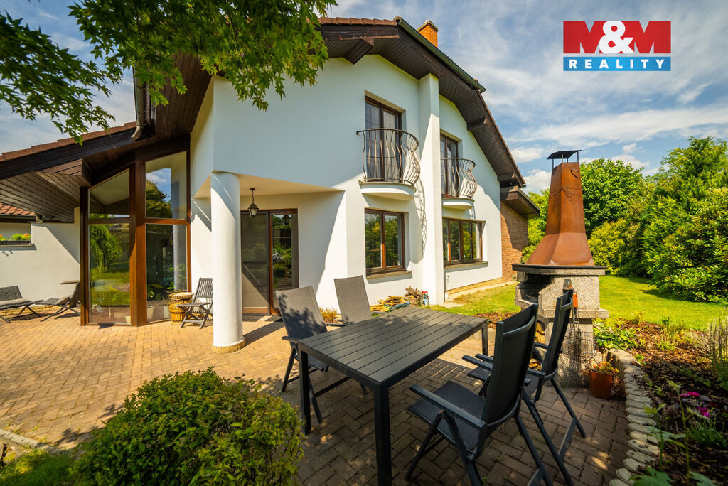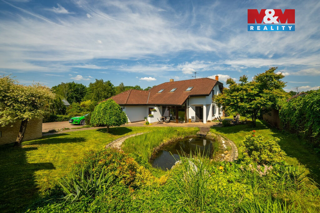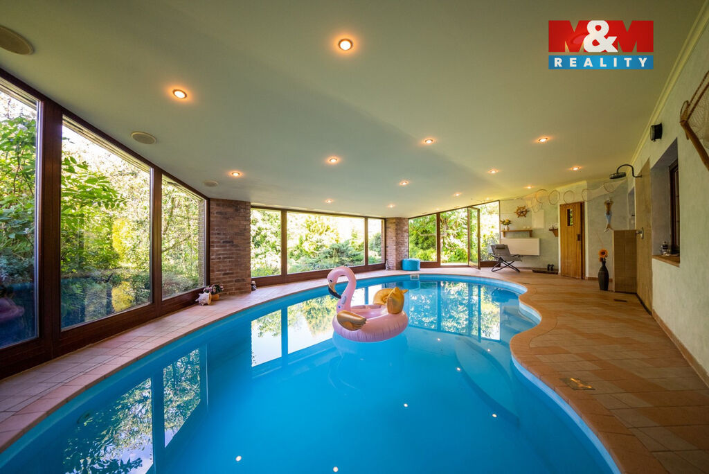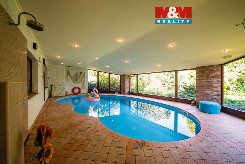 Ve výhradním zastoupení majitelů si dovolujeme nabídnout přepychový rodinný dům o dispozici 6+kk s krytým bazénem, wellness, nadstandardní garáží a překrásnou zahradou. V přízemí domu je velké zádveří přístupné i z garáže. Poté se otevírá velký obývací prostor s krbem spojený s jídelnou a velkou kuchyňskou linkou. Prosklená část obývacího prostoru nabízí posezení u krbu a další část slouží také jako prosluněná relaxační zóna. V přízemí je dále pracovna a technická místnost s toaletou. V prvním patře domu se nachází velká koupelna s masážní vanou i sprchovým koutem, ložnice se šatnou a další 3 obrovské pokoje. V zadní části domu je krytý bazén ohřívaný tepelným čerpadlem a také sauna. Dům je vytápěn plynovým kotlem. Tento krásný a atypický dům je ve velmi klidné lokalitě a náleží k němu velká okrasná zahrada s jezírkem. Zeleň okolo domu zajištuje dostatek soukromí. Neváhejte kontaktovat makléře pro více informací, případně o domluvení prohlídky. S financováním rádi pomůžeme.