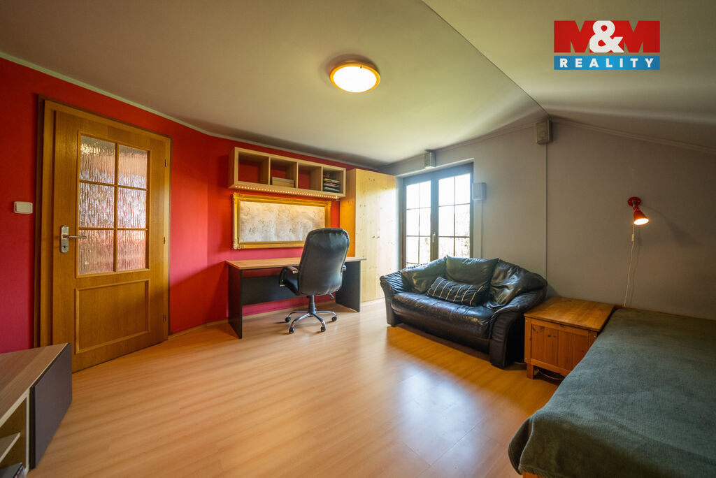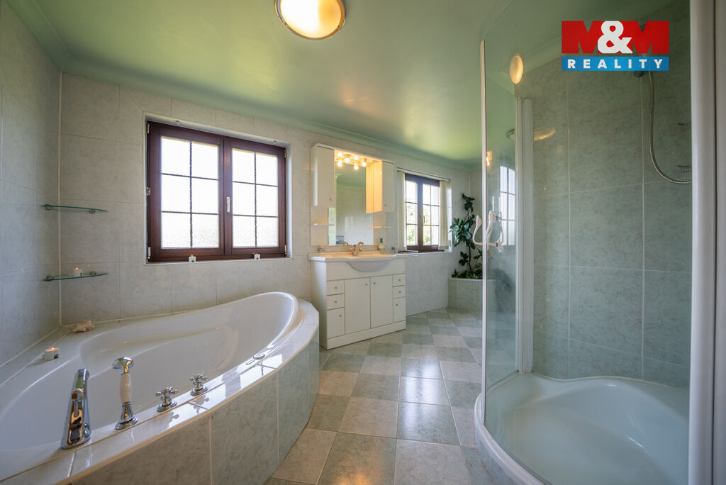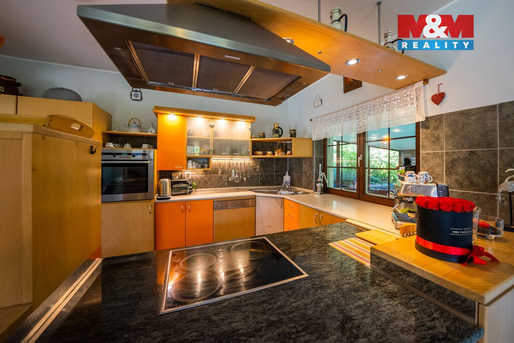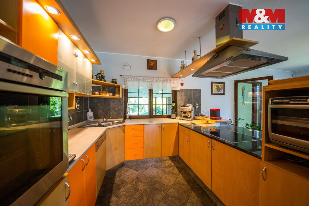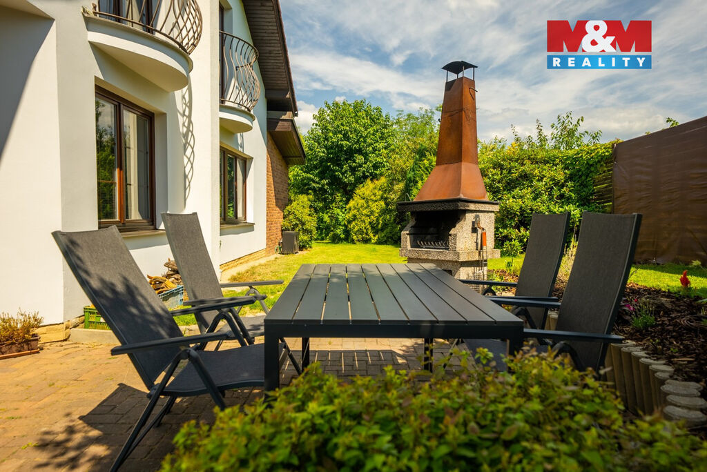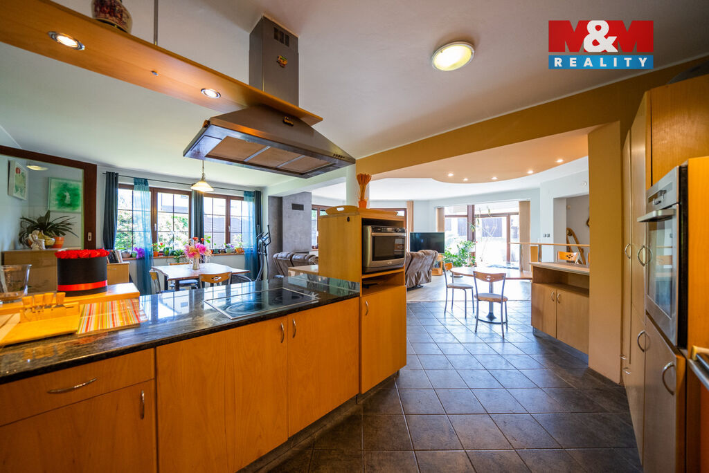 Ve výhradním zastoupení majitelů si dovolujeme nabídnout přepychový rodinný dům o dispozici 6+kk s krytým bazénem, wellness, nadstandardní garáží a překrásnou zahradou. V přízemí domu je velké zádveří přístupné i z garáže. Poté se otevírá velký obývací prostor s krbem spojený s jídelnou a velkou kuchyňskou linkou. Prosklená část obývacího prostoru nabízí posezení u krbu a další část slouží také jako prosluněná relaxační zóna. V přízemí je dále pracovna a technická místnost s toaletou. V prvním patře domu se nachází velká koupelna s masážní vanou i sprchovým koutem, ložnice se šatnou a další 3 obrovské pokoje. V zadní části domu je krytý bazén ohřívaný tepelným čerpadlem a také sauna. Dům je vytápěn plynovým kotlem. Tento krásný a atypický dům je ve velmi klidné lokalitě a náleží k němu velká okrasná zahrada s jezírkem. Zeleň okolo domu zajištuje dostatek soukromí. Neváhejte kontaktovat makléře pro více informací, případně o domluvení prohlídky. S financováním rádi pomůžeme.