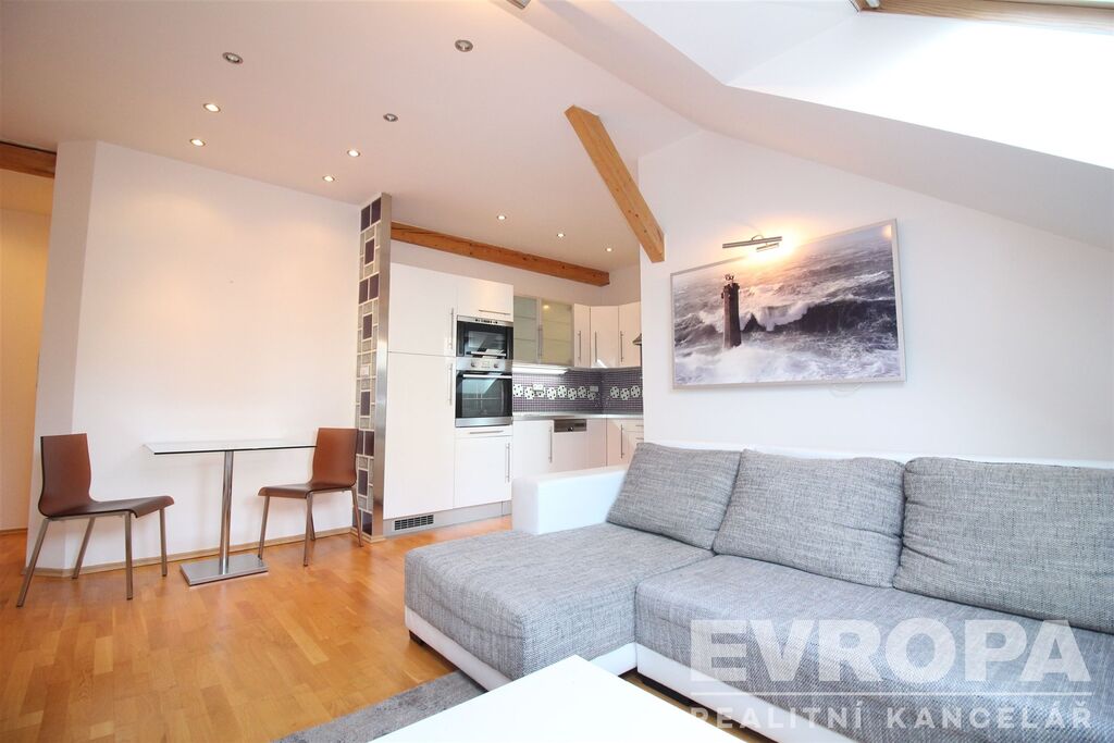 Nabízíme k pronájmu krásný byt, který se nachází ve čtvrtém patře bytového domu. Bytová jednotka byla nově kolaudována v roce 2008 a jedná se o podkrovní byt. Dispozice bytu je 2+kk, skládá se ze vstupní předsíně, prostorného obývacího pokoje, kompletně vybavená kuchyňská linka. Dále samostatná ložnice, doplněná o velkou praktickou šatnu. Velká koupelna s vanou, toaletou a pračkou. Byt je kompletně vybavený, včetně vkusného nábytku, který je na fotografiích.