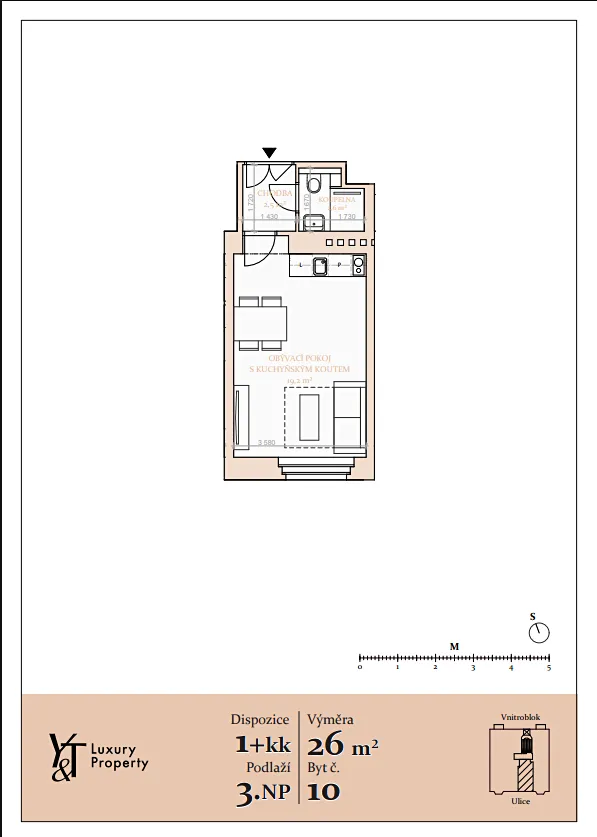 Nabízíme k pronájmu světlý byt 1+kk o velikosti 26,4 m² ve zrekonstruovaném historizujícím činžovním domě s prvky neorenezance a rané secese z roku 1890 v noblesní lokalitě Prahy. Tento byt se nachází ve 3. nadzemním podlaží s orientací do ulice a je vybaven hotovou koupelnou a kuchyňským koutem.
