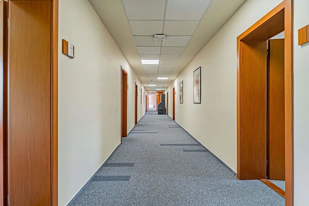 1.PP: 591,87 m2 (skladovací prostory, technické zázemí budovy, archivy, sušárna, prádelna, chladírny, mrazírny, sociální zázemí). 1.NP: 952,61 m2 (vstupní hala se zádveřím a recepcí, příjem, denní místnost, 15 kanceláří, 5 zasedaček, jídelna s bufetem a zázemím, chodby, schodiště, soc. zázemí a ostatní). 2.NP: 420,82 m2 (kuchyňka, 14 kanceláří, chodby, schodiště, soc. zázemí a ostatní). 3.NP: 422,52 m2 (kuchyňka, 12 kanceláří, chodby, schodiště, soc. zázemí a ostatní).