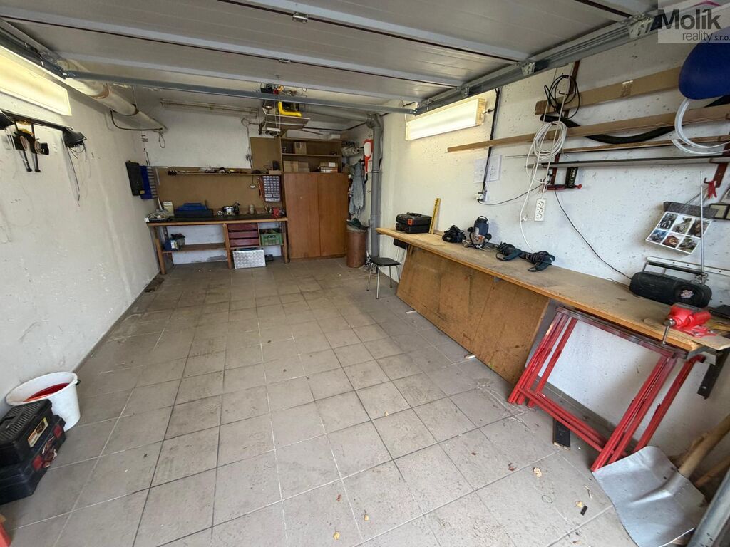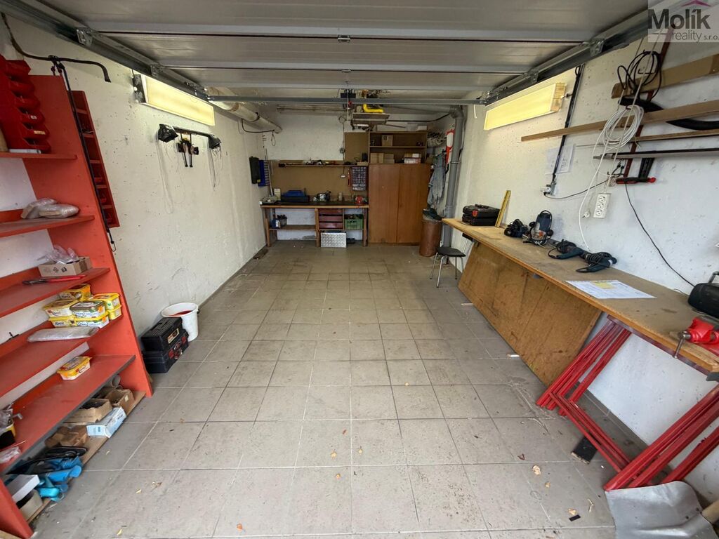 Garáž je ve slušném stavu s elektrickými vraty a zavedenou elektřinou.
