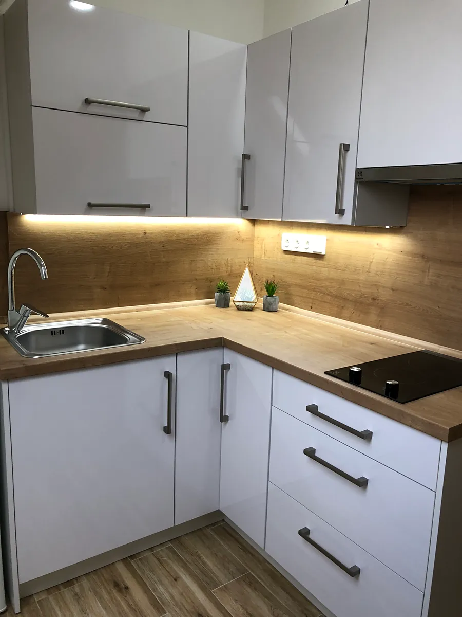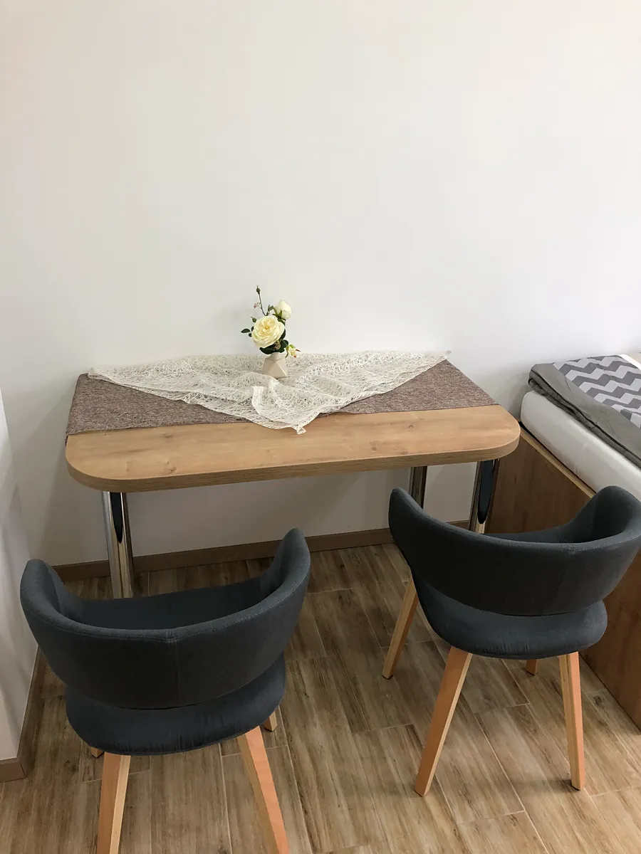 Dispozice a vybavení bytu: Kuchyňský kout se spotřebiči (lednice, varná deska, digestoř). Velkou výhodou je klimatizace. Dále je v pokoji vestavěná skříň, stůl, 2 židle, TV a dvě postele s kvalitní matrací s polštářem, přikrývkou, plachtou a povlečením. Koupelna se sprchovým koutem a WC.