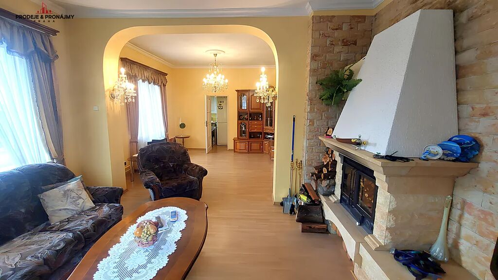 Přízemí disponuje: Pracovnou, koupelnou s vanou, samostatné WC, ložnici a prostornou obývací místnosti s funkčním krbem a vstupem do komory.