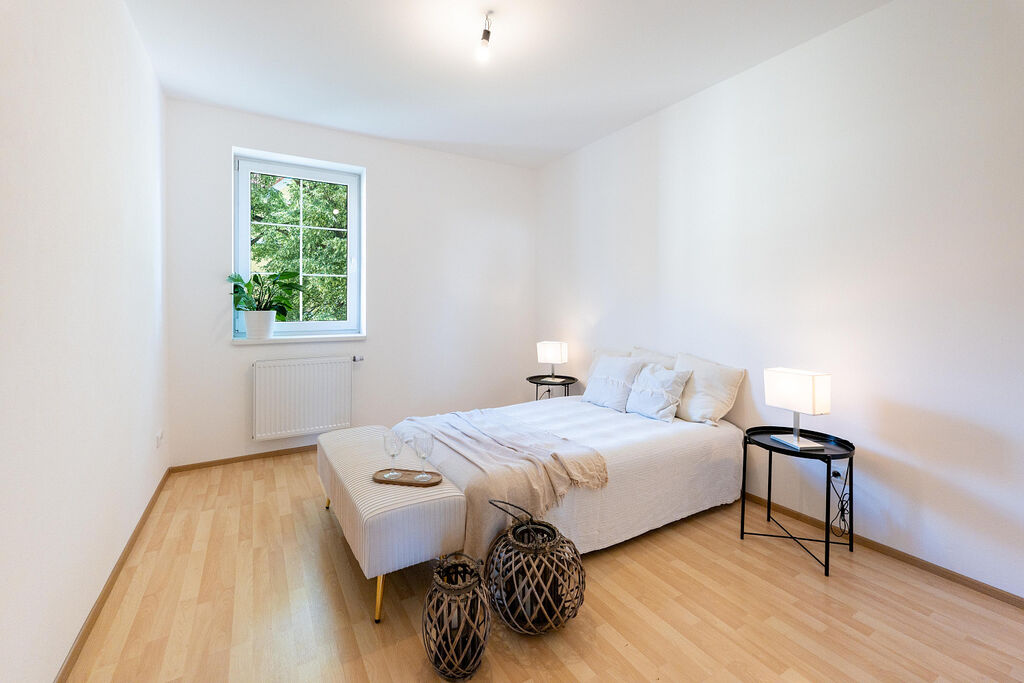 Dvě ložnice – klidná hlavní + pokoj pro děti / pracovnu / hosty.