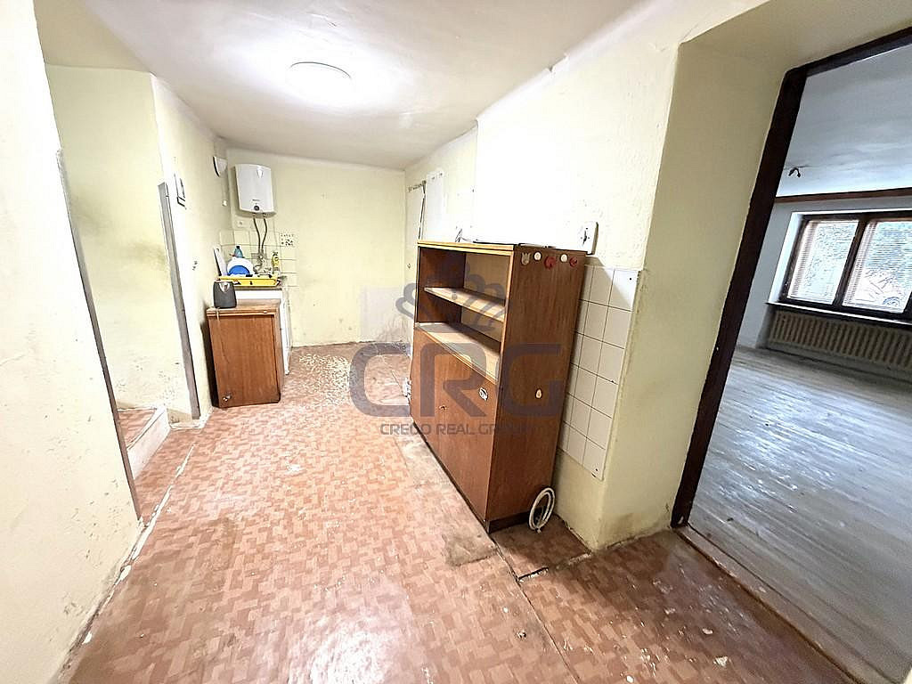 Vstupními dveřmi vejdeme do prostorné chodby o celkové ploše cca 14,2 m², která propojuje hlavní obytné části domu. Po levé straně se nachází pokoj o výměře cca 16,42 m², který může sloužit jako obývací pokoj či ložnice. Z tohoto pokoje je vstup do další místnosti o ploše cca 10,11 m², vhodné jako ložnice, dětský pokoj, šatna nebo pracovna. Z již zmíněné chodby je dále přístup do kuchyně o rozloze cca 9,64 m², kde je zároveň umístěn ohřev teplé vody. Z kuchyně vejdeme do prostorného pokoje o velikosti cca 22,47 m², který lze využít jako hlavní obývací pokoj či další ložnici. Z kuchyně je také přístup do menší místnosti o celkové ploše cca 8,03 m², jež může sloužit jako samostatná jídelna. Z této místnosti je vstup do komory o celkové ploše cca 4,34 m² a zároveň je z ní možné projít zpět do hlavní chodby, což vytváří praktické dispoziční propojení. Chodba pokračuje ke koupelně o celkové ploše cca 4,2 m² a samostatnému WC o celkové ploše cca 1,08 m². Z chodby je vstup na soukromý dvůr, odkud se vchází do jednotlivých nebytových prostor. Z dvoru je přístup na půdu nad domem o výměře cca 68,52m², která přímo vybízí k půdní nástavbě. Nachází se zde komora o rozloze cca 7,55 m², ze které vedou schody do sklepa o celkové ploše cca 5,76 m². Na dvoře jsou dále tři menší nebytové prostory o celkových plochách cca 5,13 m², 4,78 m² a 2,59 m².