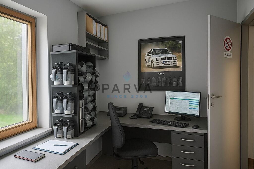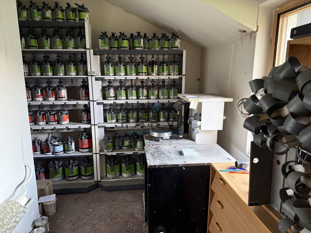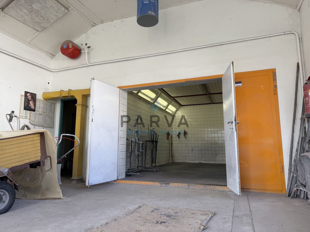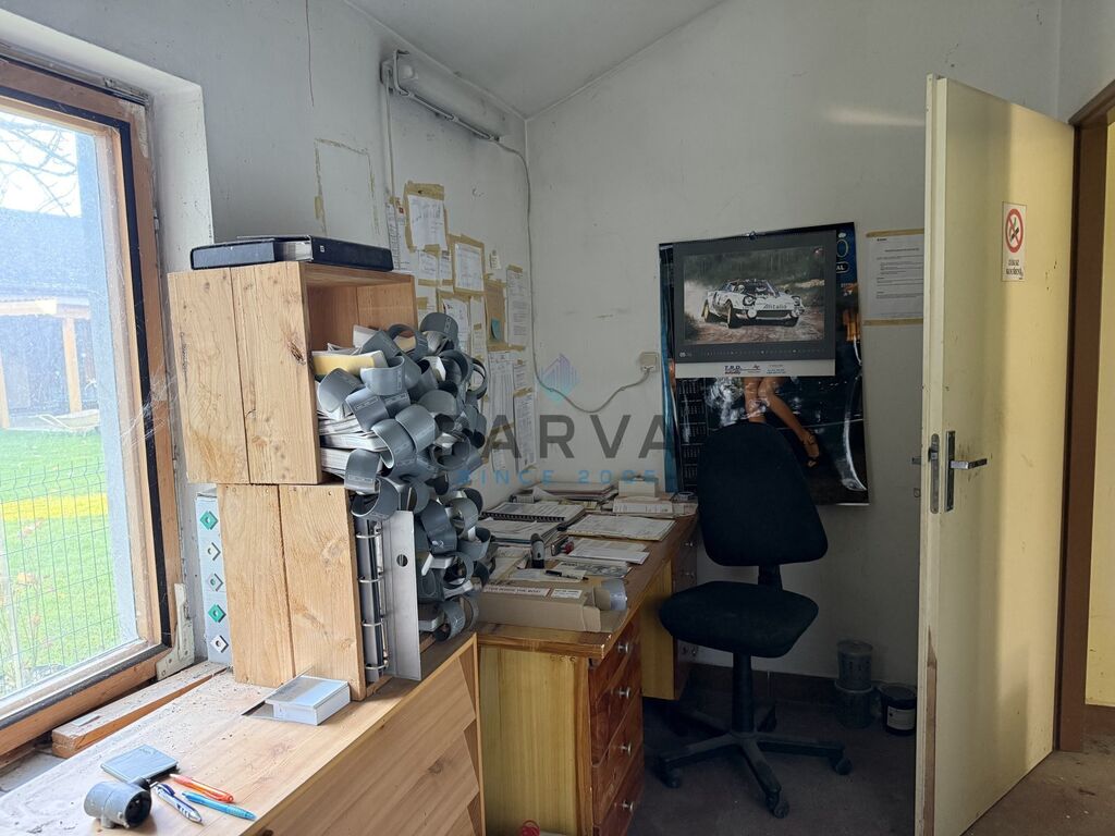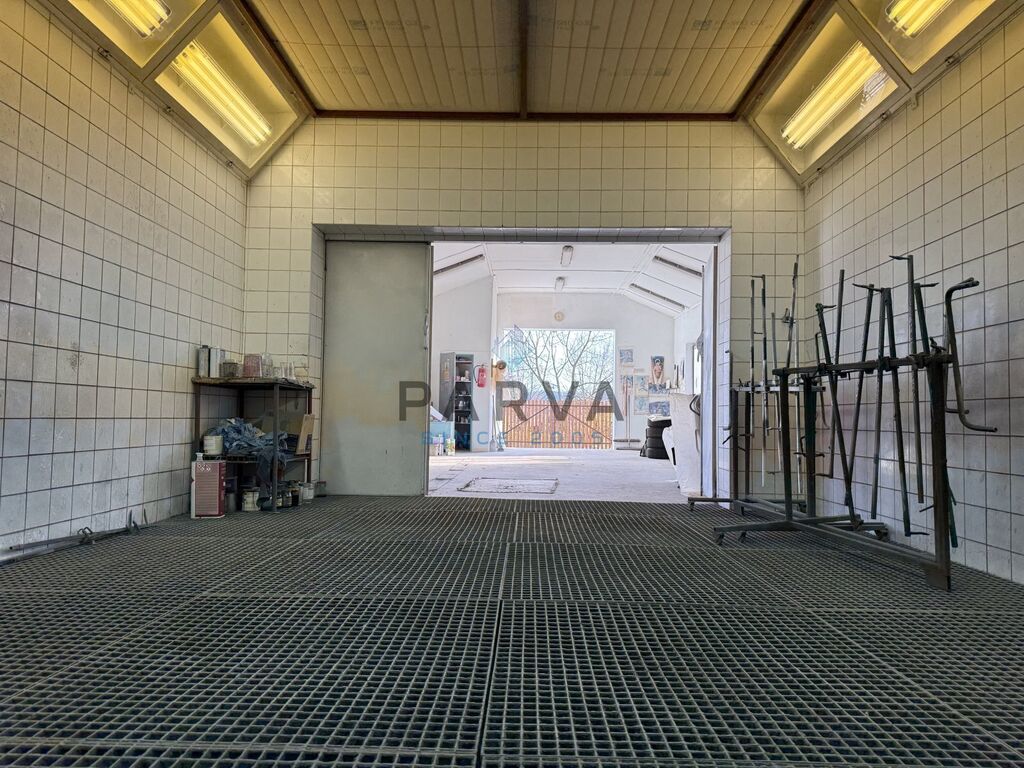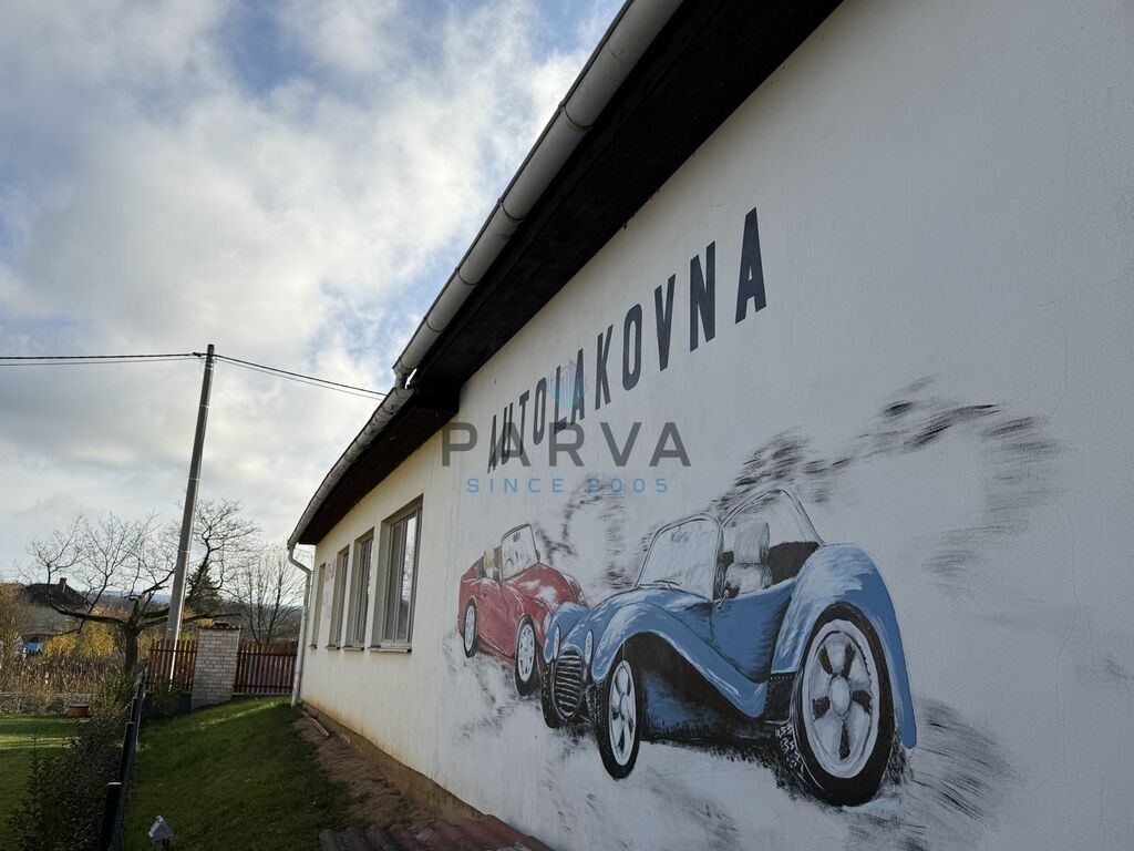 Nemovitost je zděná a rozdělená na tři části - hala, kancelář a místnost která sloužila na lakování aut. Kotelna s kotlem na tuhá paliva je vedlejší stavba se samostatným vchodem.