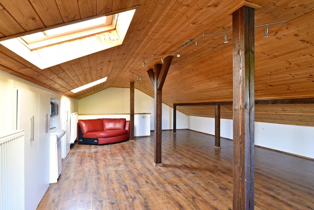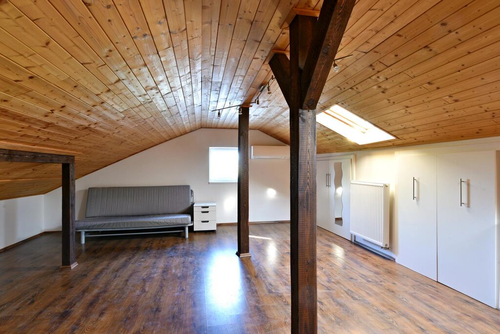 V patře je umístěna velkorysá podkrovní místnost s dostatkem úložných prostor, ideální pro hlavní pracovní plochu či otevřené studio.