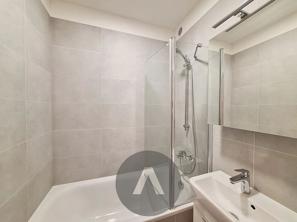 V koupelně se nachází vana se skleněnou zástěnou a umyvadlo se zrcadlem.