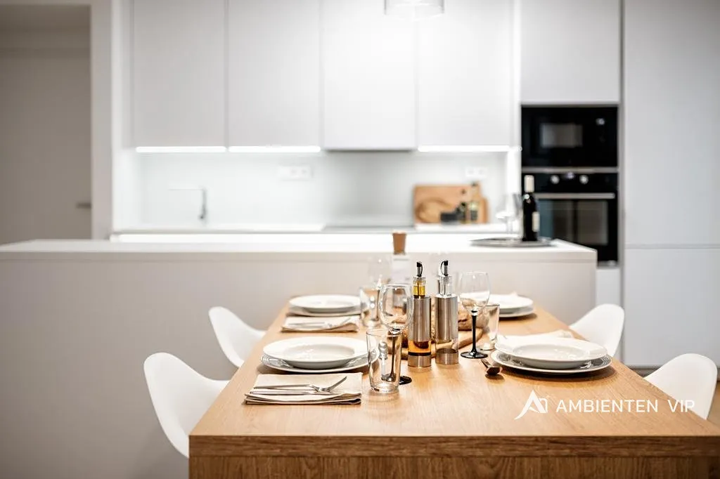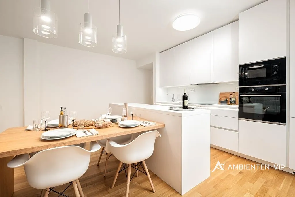 Kuchyňská linka je vybavená vestavnými spotřebiči: indukční varná deska, trouba, mikrovlnná trouba, digestoř, myčka a lednice s mrazákem.