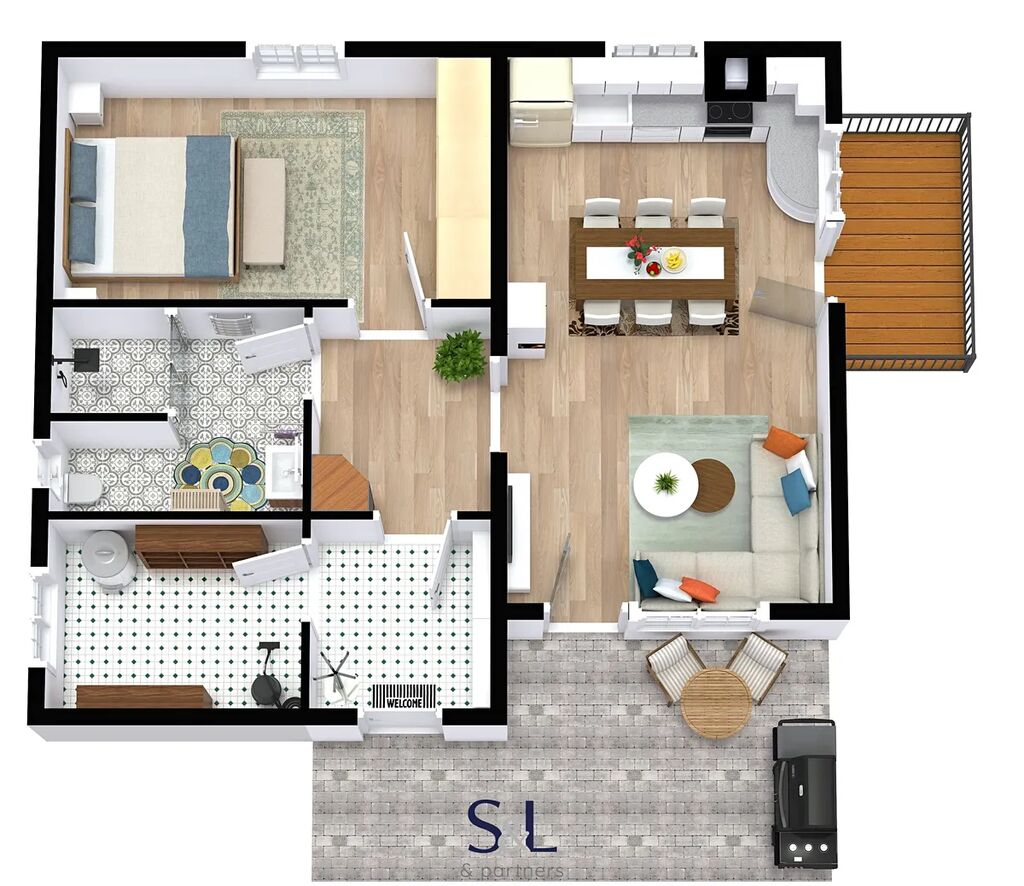 Dům je postaven v moderním skeletovém systému LIGASTEEL z ocelových profilů, který zajišťuje pevnost, dlouhou životnost i rychlou výstavbu. Dispozice 2+kk nabízí prostorný obývací pokoj s kuchyňským koutem (včetně vestavných spotřebičů), samostatnou ložnici, koupelnu se sprchovým koutem a technickou místnost.