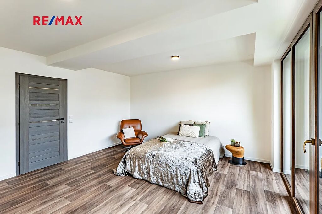 První nadzemní podlaží nabízí elegantní ložnici s vlastním balkonem, koupelnu se sprchovým koutem, samostatné WC a hlavní obytnou část propojenou se stylově řešenou kuchyní a jídelnou. Samozřejmostí jsou špičkové spotřebiče, vestavěná vinotéka a praktická spižírna.