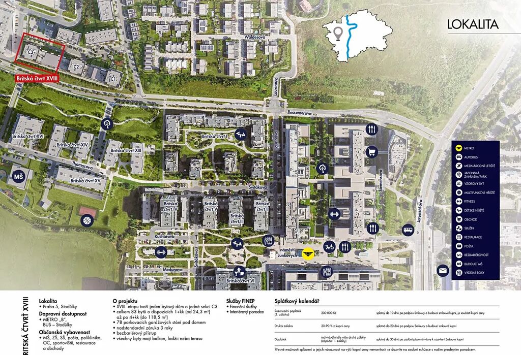 Nabízíme k prodeji byt o dispozici 4+kk v osobním vlastnictví. V developerském projektu Britská čtvrť od společnosti Finep. Užitná plocha bytu je 97,3 m2 + lodžie výměře 10,4 m2. Byt se nachází v pátém patře domu s označením C3 a má ideální jižní orientaci. K bytu je možné přikoupit dvě garážové stání a komoru 3,9 m2 vše umístěno ve 1PP. Projekt Britská čtvrť nabízí vynikající dostupností, pouze jednu minutu chůze od stanice Stodůlky V blízkosti je kompletní občanská vybavenost, jako: poliklinika, školy, školky a obchody a supermarkety.